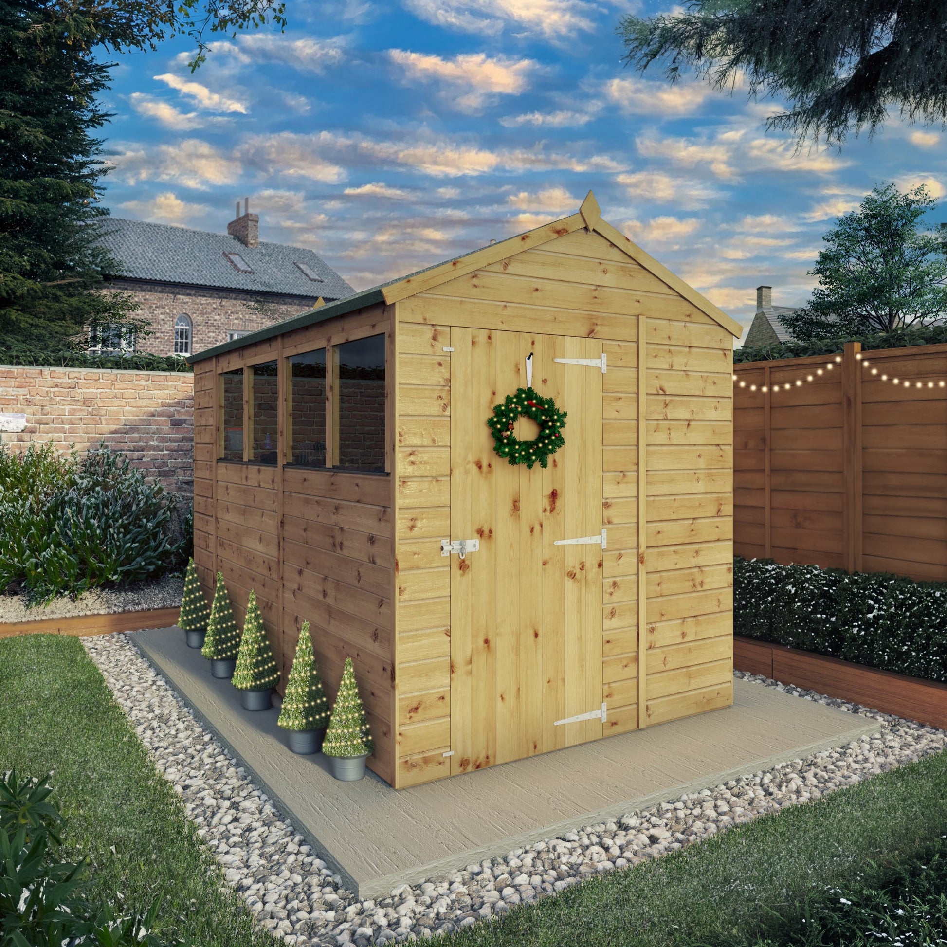 Discover the flexibility and functionality of our 10ft x 6ft Shiplap Apex Shed, an ideal storage solution for larger items. Crafted with premium interlocking tongue and groove boards in a Shiplap profile, this shed boasts a protective lip that creates a strong and weatherproof structure. The floor and roof, constructed with heavy-duty tongue and groove boards, ensure the shed can withstand everyday use with ease. Thick internal framing provides additional support, resulting in a rigid and long-lasting building. The modular design of this shed allows for easy reconfiguration of wall panels to suit your unique needs and preferences. Whether you need to move the door or adjust window placement, customization is simple and efficient. Manufactured in the UK with sustainably sourced timber, this shed comes with a 10-year anti-rot guarantee for peace of mind. With robust fixtures and fittings included, along with our detailed assembly instructions, setting up this shed is straightforward and stress-free. To maintain the guarantee, simply treat the building with a high-quality timber preservative and waterproof top coat upon construction.