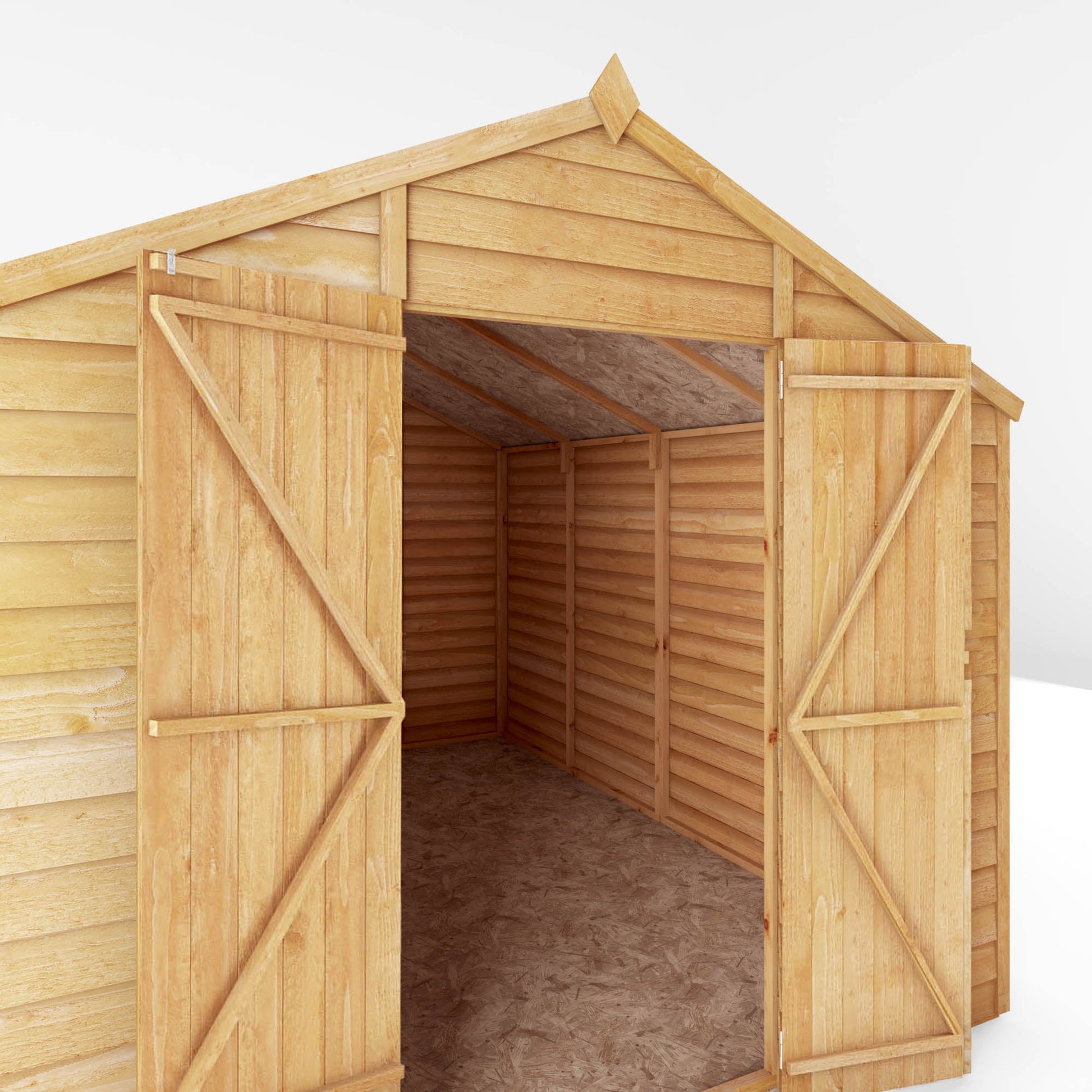 The 10x8 Overlap Apex Garden Shed provides generous storage for large garden items, including bikes, furniture, and tools. Double doors allow easy access, while shatterproof styrene windows fill the space with natural light. Made in the UK from sustainably sourced timber, it features 7mm overlap cladding, a solid sheet floor and roof, and an apex design for extra height and rainwater drainage. Includes a 10-year anti-rot guarantee and 12-month warranty.