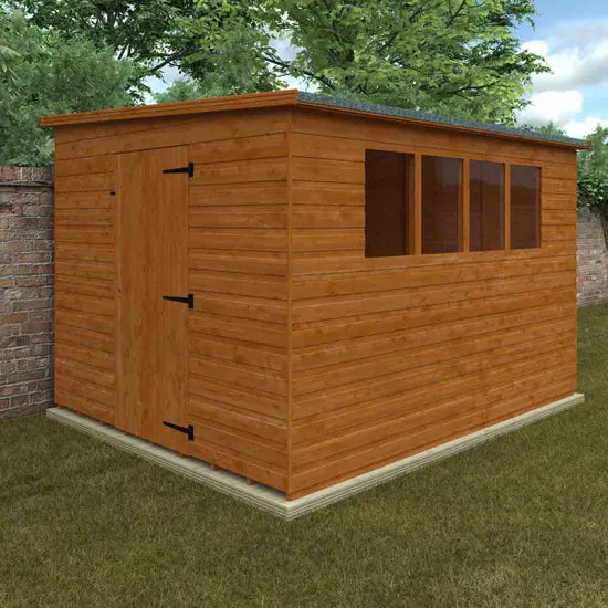 - Classic lean-to pent shed design with gable end door for convenient entry