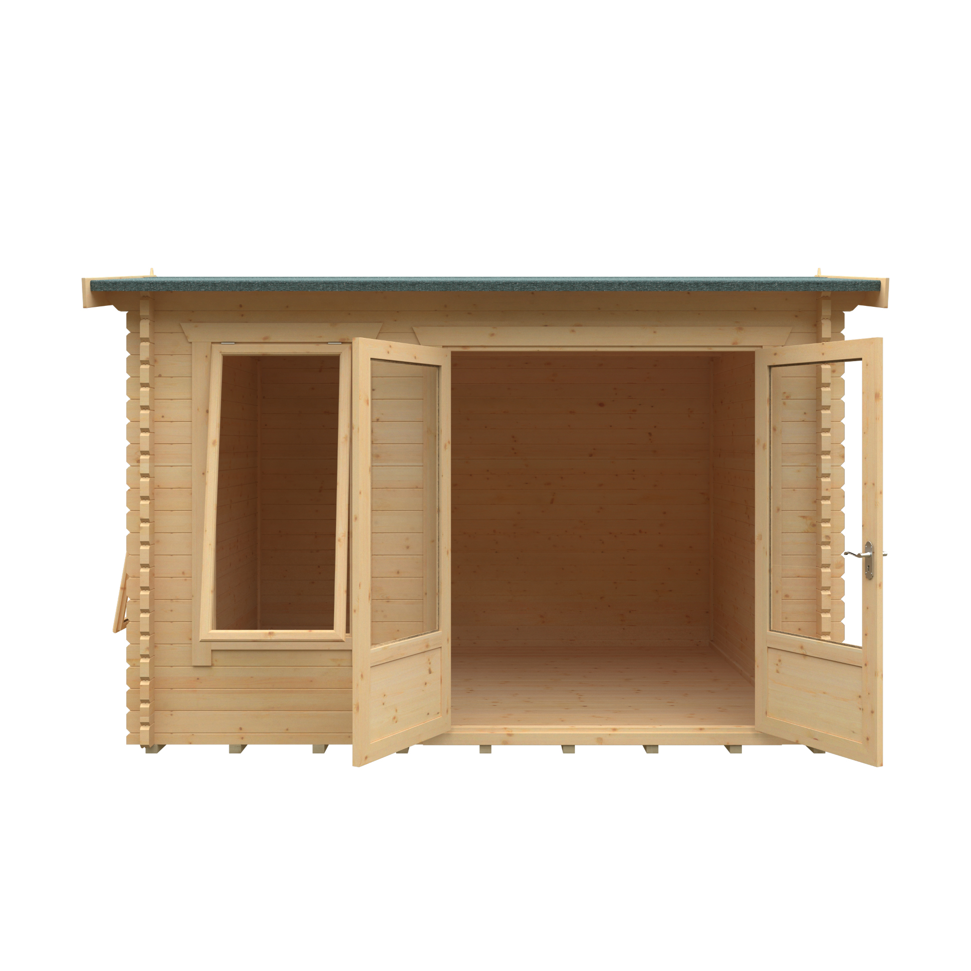 - Grey Mineral Felt Roof Covering: Protects the cabin from harsh weather while providing a weather-resistant finish.