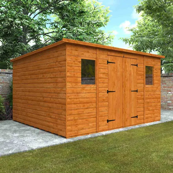The Workman Pent is a premium flat-roof garden shed offering style, strength, and generous storage space. Inspired by the popular Workman Apex, it features durable 12mm shiplap tongue & groove cladding, premium European softwoods, and a sturdy four-corner framework. With excellent eaves height, double full-boarded doors, and toughened glazed windows, it’s ideal for both storage and workshop use. Finished with weather-resistant grey mineral felt roofing, it’s built to last.
