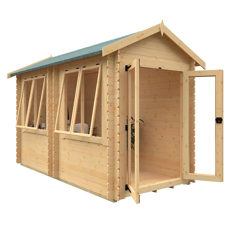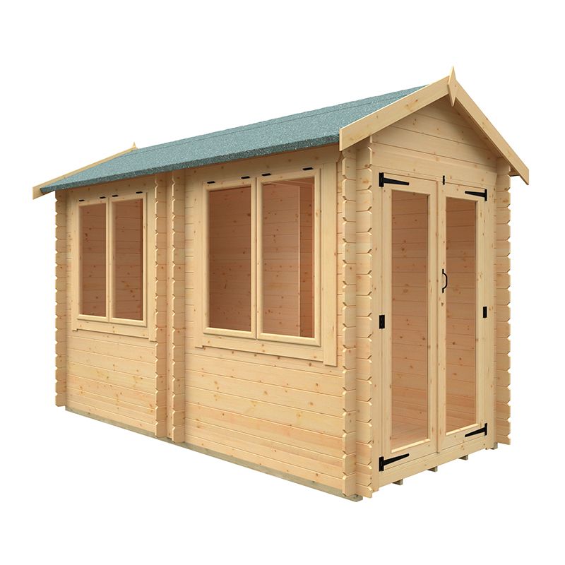 The 12x6 Oriana | Flex 19mm Garden Building is a stylish and versatile outdoor structure, ideal for use as a garden office, studio, or retreat. Built from 19mm interlocking logs, it offers strength, insulation, and durability. Featuring half-glazed double doors, a top-hinged opening window, and a pre-assembled roof for easy installation, this cabin provides natural light, ventilation, and a customizable untreated timber finish to suit any garden style.