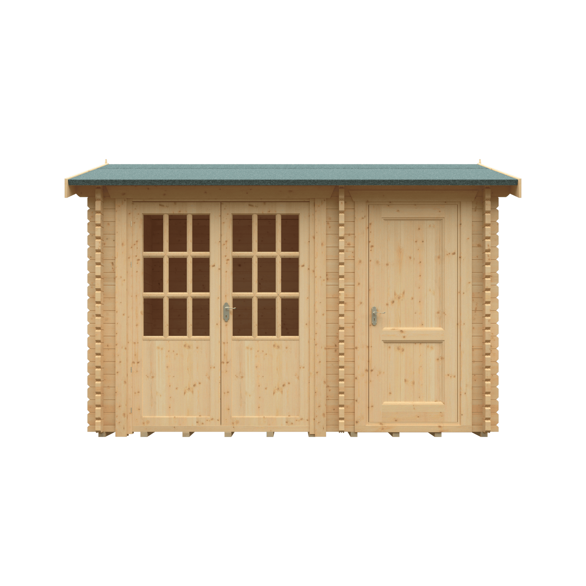 The 12x8 Chatsworth | 44mm Log Cabin offers premium craftsmanship in a compact design, perfect for smaller gardens. Built with 44mm thick tongue-and-groove logs, it provides excellent year-round insulation and durability. Featuring elegant Georgian-style double doors and a bright, welcoming interior, this versatile cabin is ideal for use as a home office, garden studio, or extra storage space without compromising on quality.