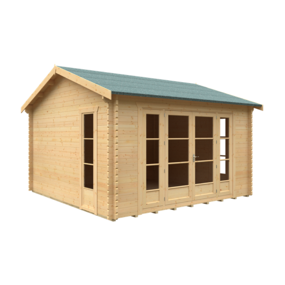 The 14x14 Bamber Log Cabin is the ideal combination of style, durability, and versatility. Constructed from 44mm thick logs, it offers superior insulation and can be used for a variety of purposes such as a home office, garden retreat, or extra living space. Designed with classic charm and modern construction methods, the Bamber cabin provides a durable structure that is easy to maintain. Featuring double-glazed windows and full-glazed double doors, it ensures plenty of natural light and excellent views of your garden.