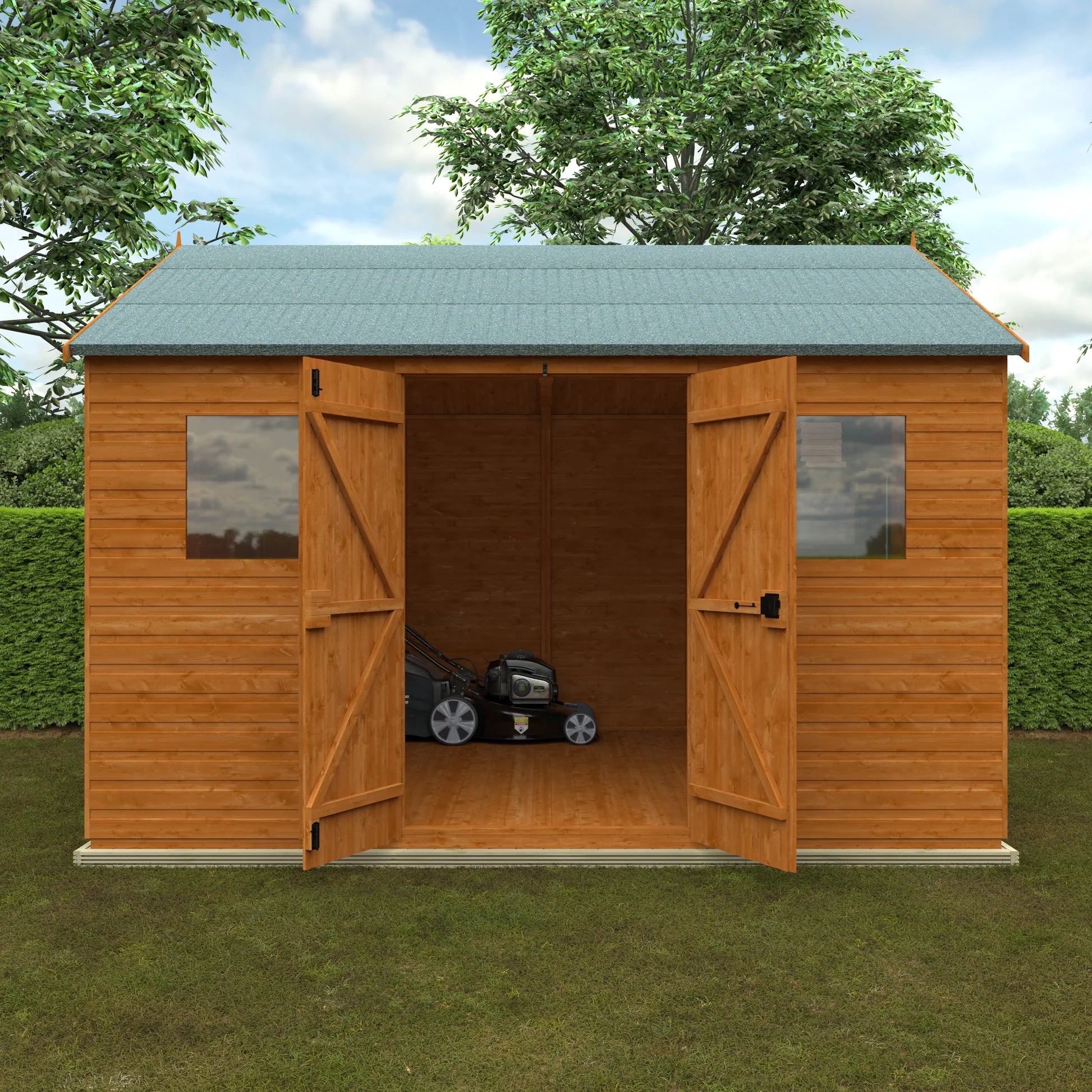 The 18x10 Workman Apex Shed delivers spacious, durable, and stylish outdoor storage. Its classic apex roof boosts headroom and rain runoff, while 12mm tongue & groove cladding and toughened glass windows provide lasting protection. Featuring six fixed windows, lockable double doors, and a robust 12mm floor, this premium shed is perfect for safely storing tools, garden equipment, and seasonal items in any weather.