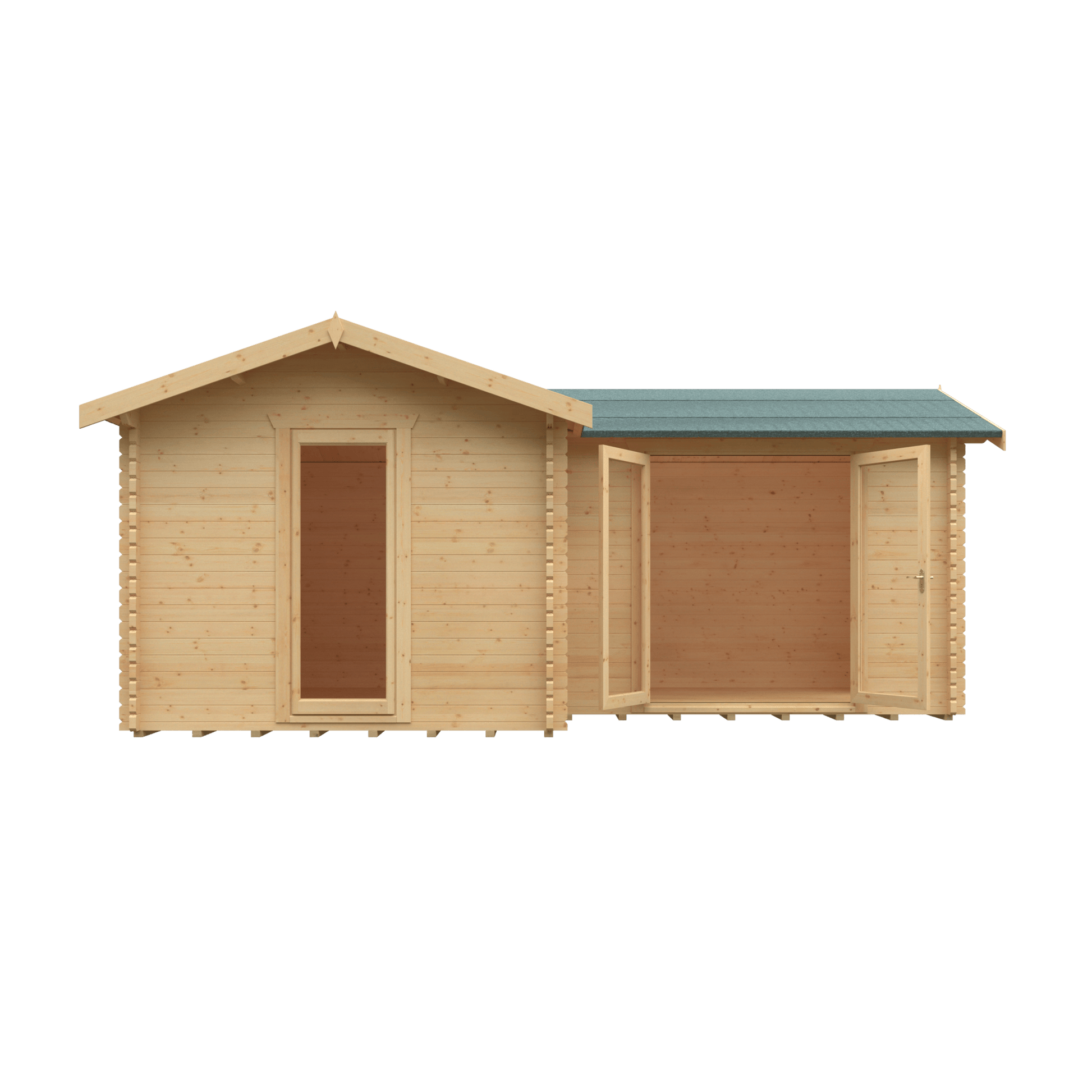 The 18x14 L-Shaped Cabin | 44mm Log Cabin offers a spacious and versatile design, perfect for a home office, leisure retreat, or guest space. Its innovative L-shape maximizes functionality while the 44mm thick logs ensure superior insulation year-round. Crafted with premium tongue-and-groove construction, large joiner-made windows, and double doors, this durable log cabin blends classic style with modern comfort.