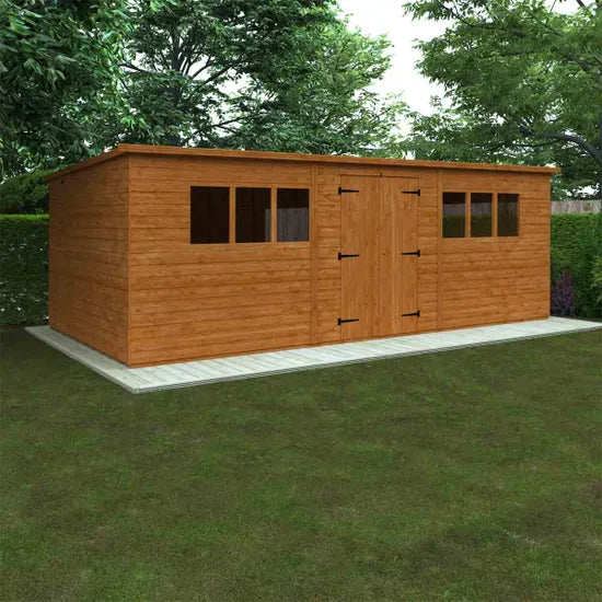 The Workman Pent is a spacious, modern flat-roof shed crafted for style, strength, and maximum storage capacity. Based on the popular Workman Apex, it features 12mm shiplap tongue & groove cladding, premium European softwoods, and a robust four-corner framework. With excellent eaves height, wide double doors, and toughened glazed windows, it’s perfect for storage or workshop use. Finished with grey mineral felt roofing, it offers lasting weather protection and comes with a 10-year guarantee.