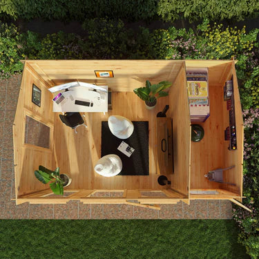 Discover the perfect garden retreat with this 4.6m x 3m contemporary log cabin featuring a convenient side shed for extra storage. Floor-to-ceiling SAN styrene glazed windows flood the interior with natural light, while robust 19mm interlocking logs ensure durability and insulation. The side shed offers practical space to declutter or store garden tools. Crafted in the UK from sustainable timber, this untreated cabin is ideal for customization and year-round enjoyment.