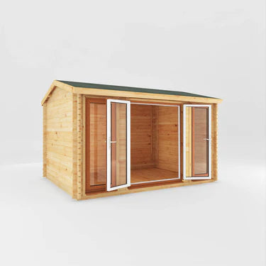 Transform your garden with the 4m x 3m Home Office Studio Log Cabin with Oak UPVC. Perfect for a home office, studio, or hobby room, this log cabin features double-glazed UPVC doors and windows, a high apex roof for extra headroom, and durable 44mm interlocking logs for year-round use. Two large windows and wide double doors flood the space with natural light, while the oak UPVC adds charm, security, and low-maintenance practicality.
