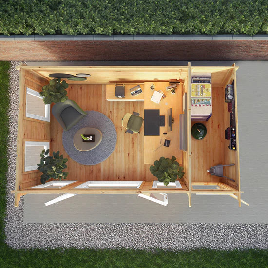- Durable 44mm thick interlocking timber walls for insulation and strength