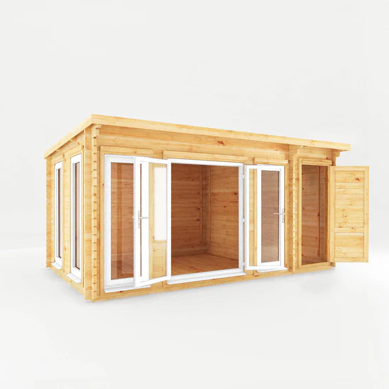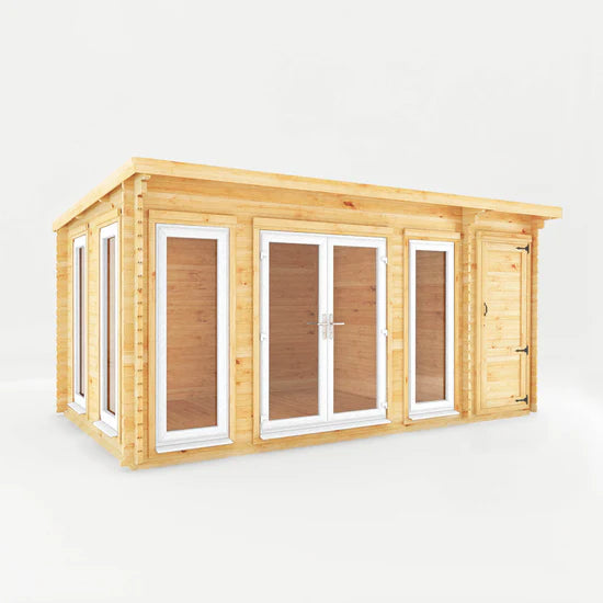 Mercia 5.1m x 3m Studio Pent Log Cabin With Side Shed - 44mm (UPVC Windows & Door) - White