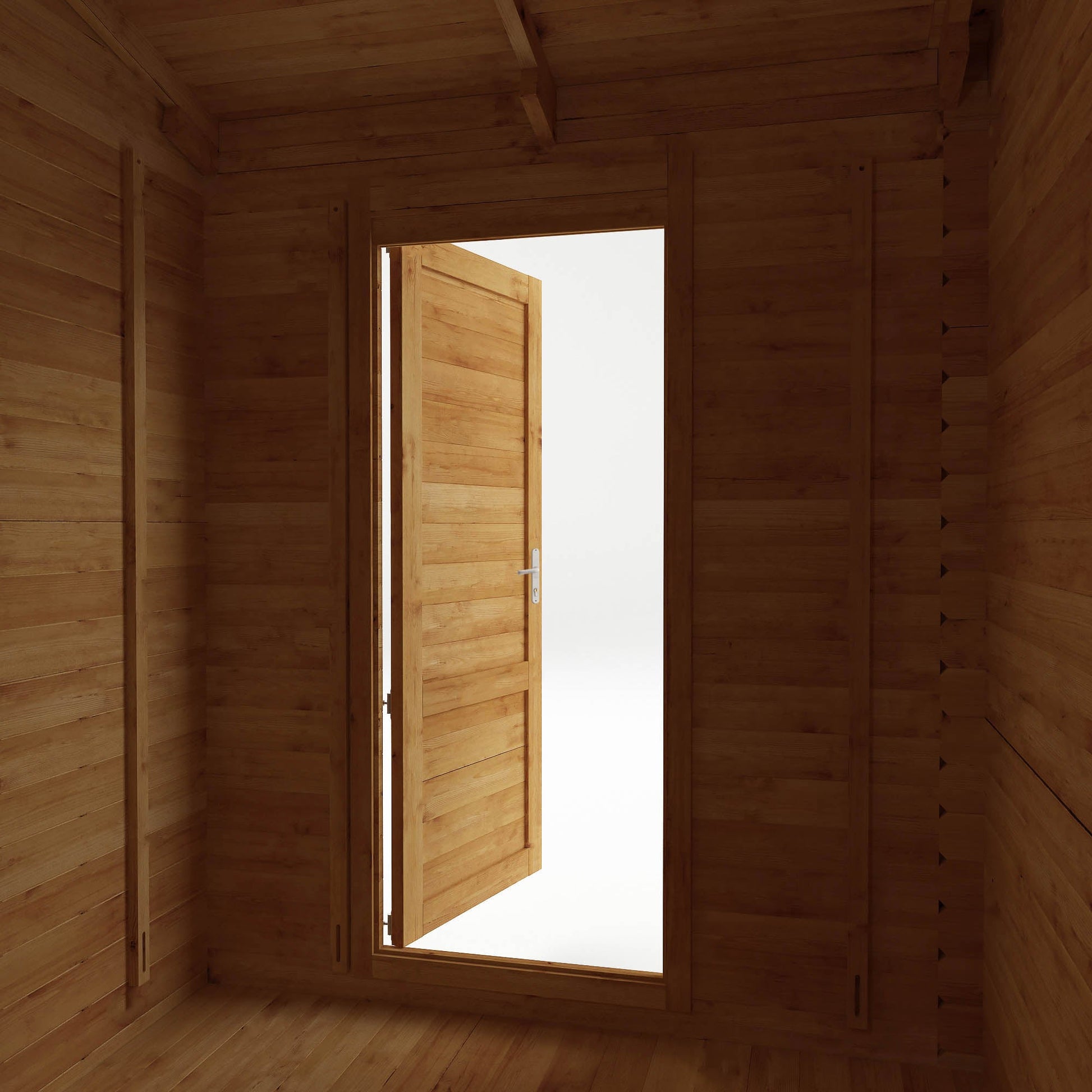 Constructed from high-quality log boards, the Corner Lodge Plus Log Cabin features an interlocking system that creates a tight seal, protecting the building from water ingress and draughts. This method of construction ensures a strong and heat-retaining structure, allowing you to use the cabin in any weather. The tongue and groove roof and floor boards provide a heavy-duty finish, perfect for supporting heavy furniture and frequent use. The high, hipped roofline is ideal for installing ceiling lights, and the roof is covered with high-quality roofing felt for added weather protection. Double glazing is standard, enhancing insulation and soundproofing. The cabin also includes a secure mortise lock and key for added security.