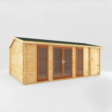 Upgrade your garden with the 6.1 x 4m Home Office Studio Log Cabin – the perfect outdoor retreat for work, fitness, or relaxation. Featuring double-glazed UPVC windows and doors, a high apex roof, and a side storage shed, this cabin combines function and elegance. Built with 44mm interlocking logs and 16mm tongue & groove roof and flooring, it's durable, stylish, and insulated year-round. Includes a 10-year anti-rot guarantee.