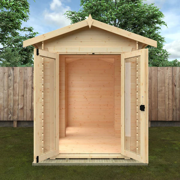 The 6x6 Beaumont Apex Garden Building combines elegant design with practical versatility. Built from 19mm Flex Tongue & Groove cladding and featuring an apex roof, it maximises headroom and interior space. Two full-length toughened glass windows and full-glazed double doors flood the interior with natural light, creating a bright and inviting atmosphere. Perfect as a garden retreat, home office, or stylish entertainment hub, it offers lasting durability with a timeless look.