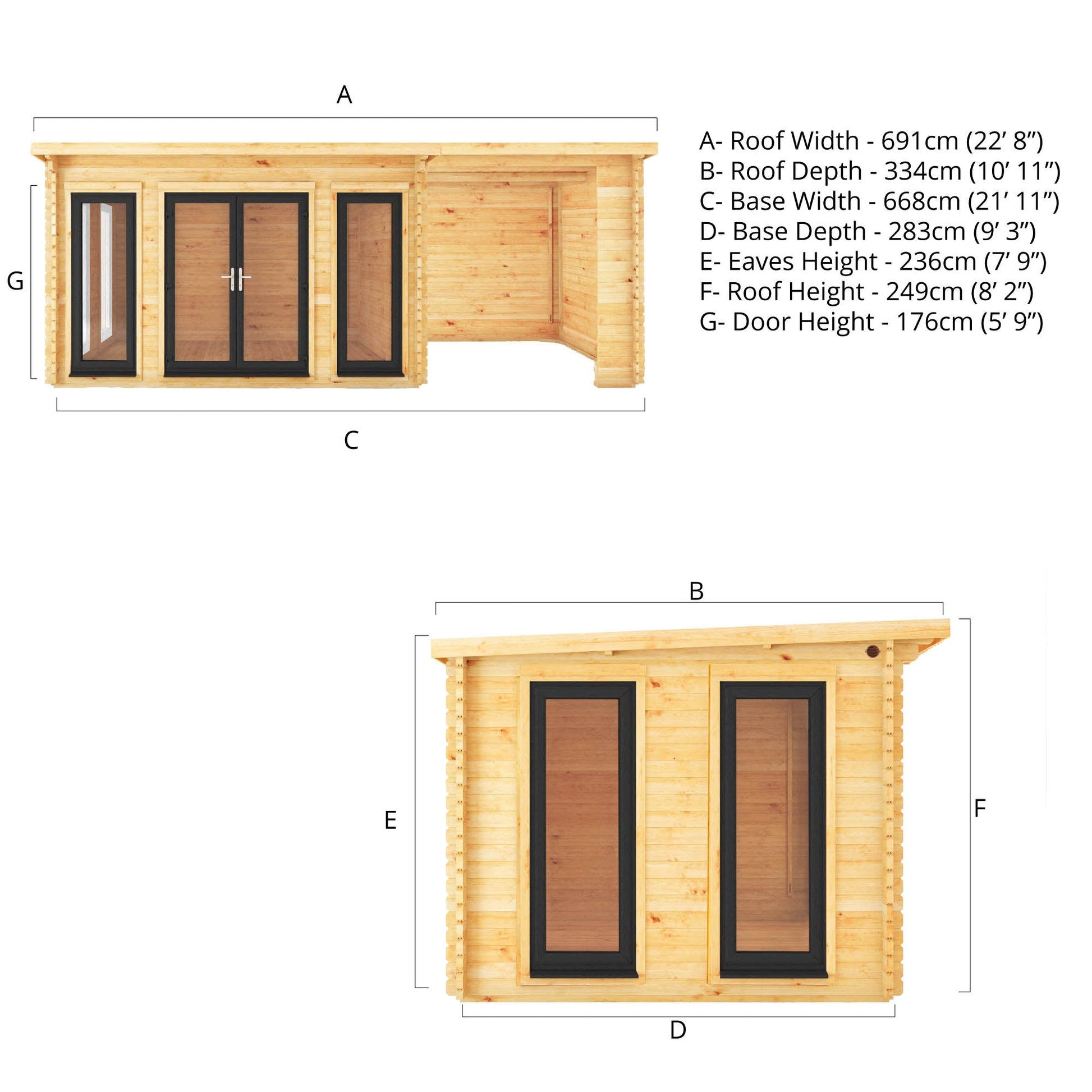 Mercia 7m x 3m Studio Pent Log Cabin With Patio Area - 44mm (UPVC Windows & Door) - Grey