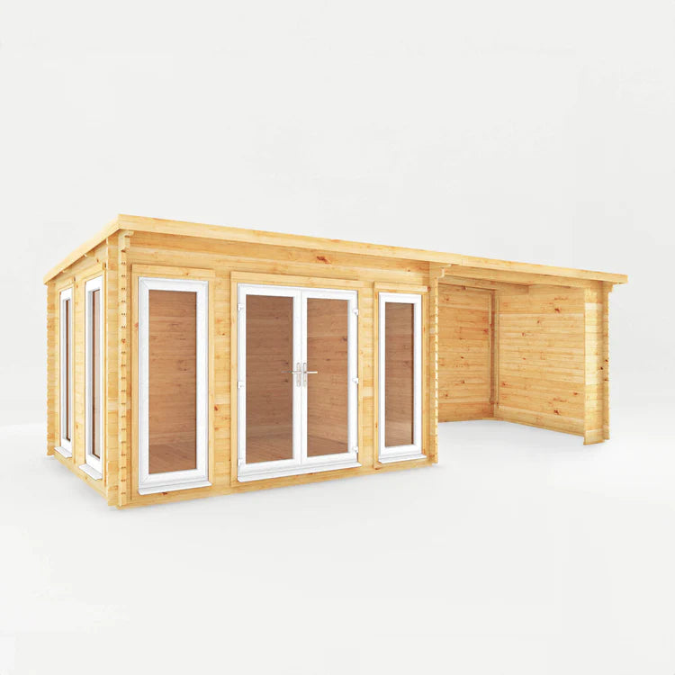 Mercia 7m x 3m Studio Pent Log Cabin With Patio Area - 44mm (UPVC Windows & Door) - White