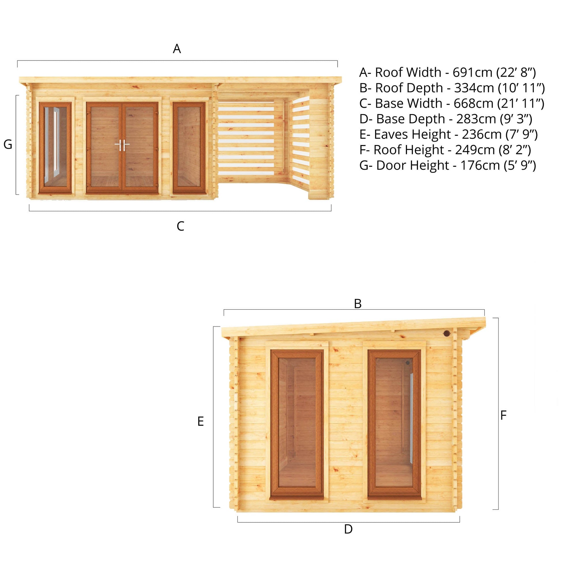 The spacious Studio Pent Log Cabin with Slatted Area (7m x 3m) combines modern style and practical design. Its chic pent roof efficiently channels rainwater, enhancing durability. Featuring four full-length UPVC double-glazed windows and glass double doors, it floods the interior with natural light. The versatile 28mm thick slatted area, positionable on either side, offers the perfect spot for relaxing or entertaining all year round.