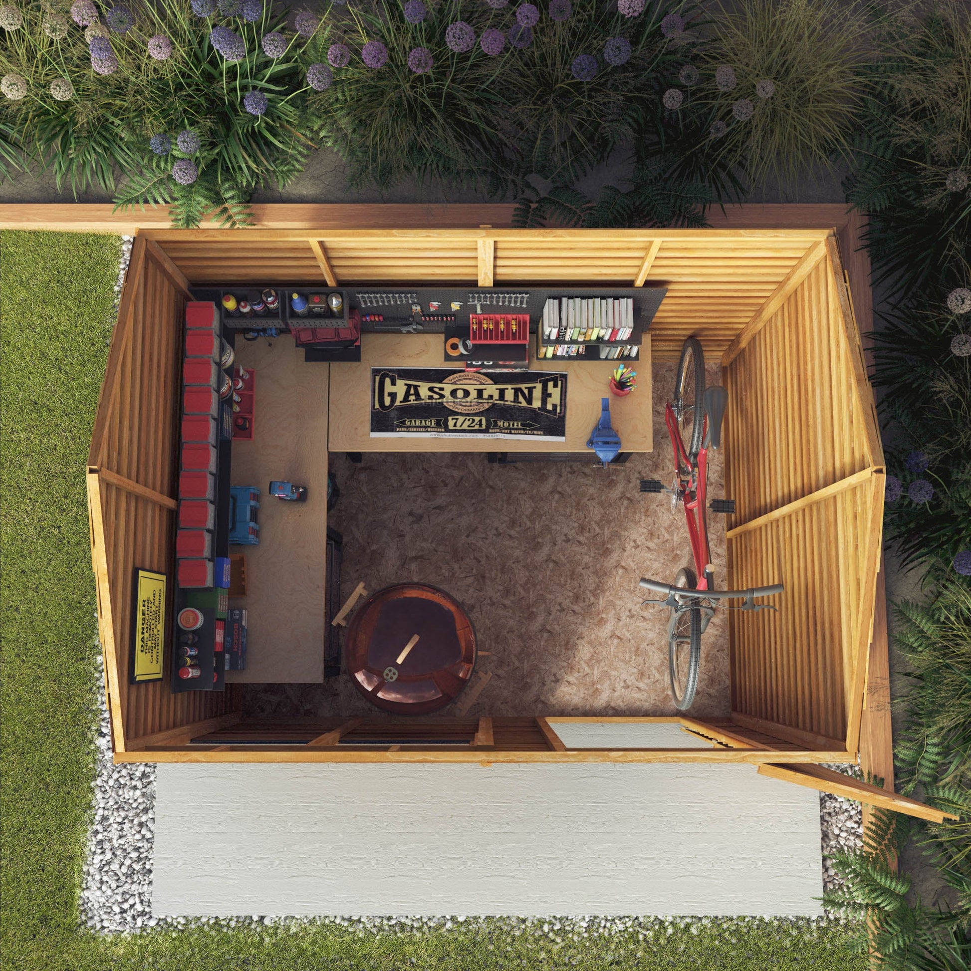 The 8x6 Reverse Apex Overlap Shed offers spacious, durable storage for garden tools, furniture, and equipment. Featuring a shatterproof styrene window, it provides a bright interior while keeping items safe. Built in the UK from sustainably sourced timber with 7mm overlap cladding and a solid sheet roof and floor, it’s designed for strength and weather resistance. The reverse apex roof adds headroom, while mineral felt and a 10-year anti-rot guarantee ensure long-lasting protection.