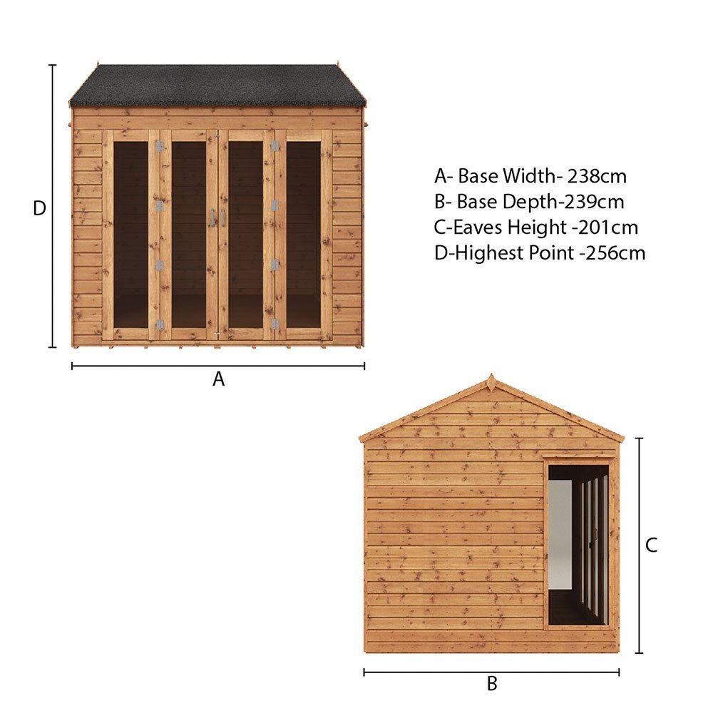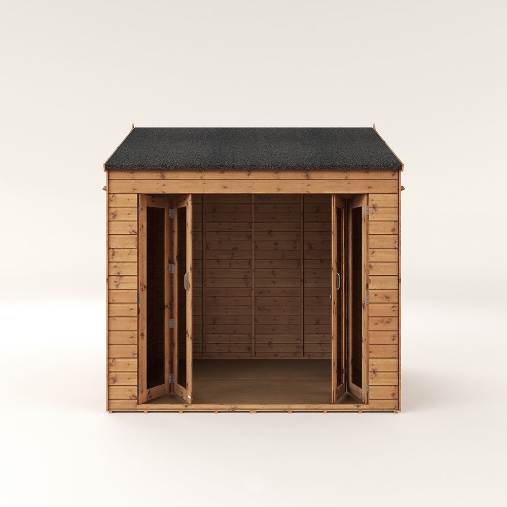 The Mercia 8x8 Vermont Summerhouse is a stylish and durable garden retreat, perfect for relaxing or entertaining all year round. Featuring bi-folding doors, shatterproof styrene glazing, and bright side windows, it blends indoor comfort with outdoor beauty. Crafted from 12mm shiplap tongue & groove timber with a robust floor and roof, it includes a 10-year anti-rot guarantee, press lock security, and sustainable UK-sourced wood for lasting quality.