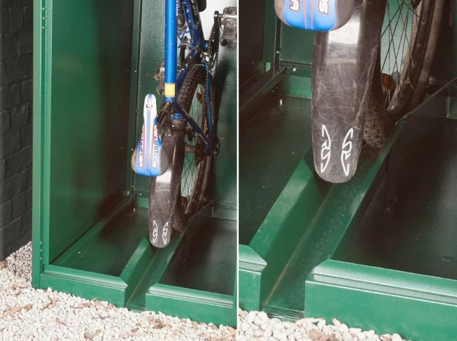 The process is simple - open the heavy-duty, fully galvanised door, slide your bike into the wide guide rail, and watch as the wheel retaining hook secures your bike in place. Inside the locker, there are hooks to hang your helmet and bags, keeping everything organised.