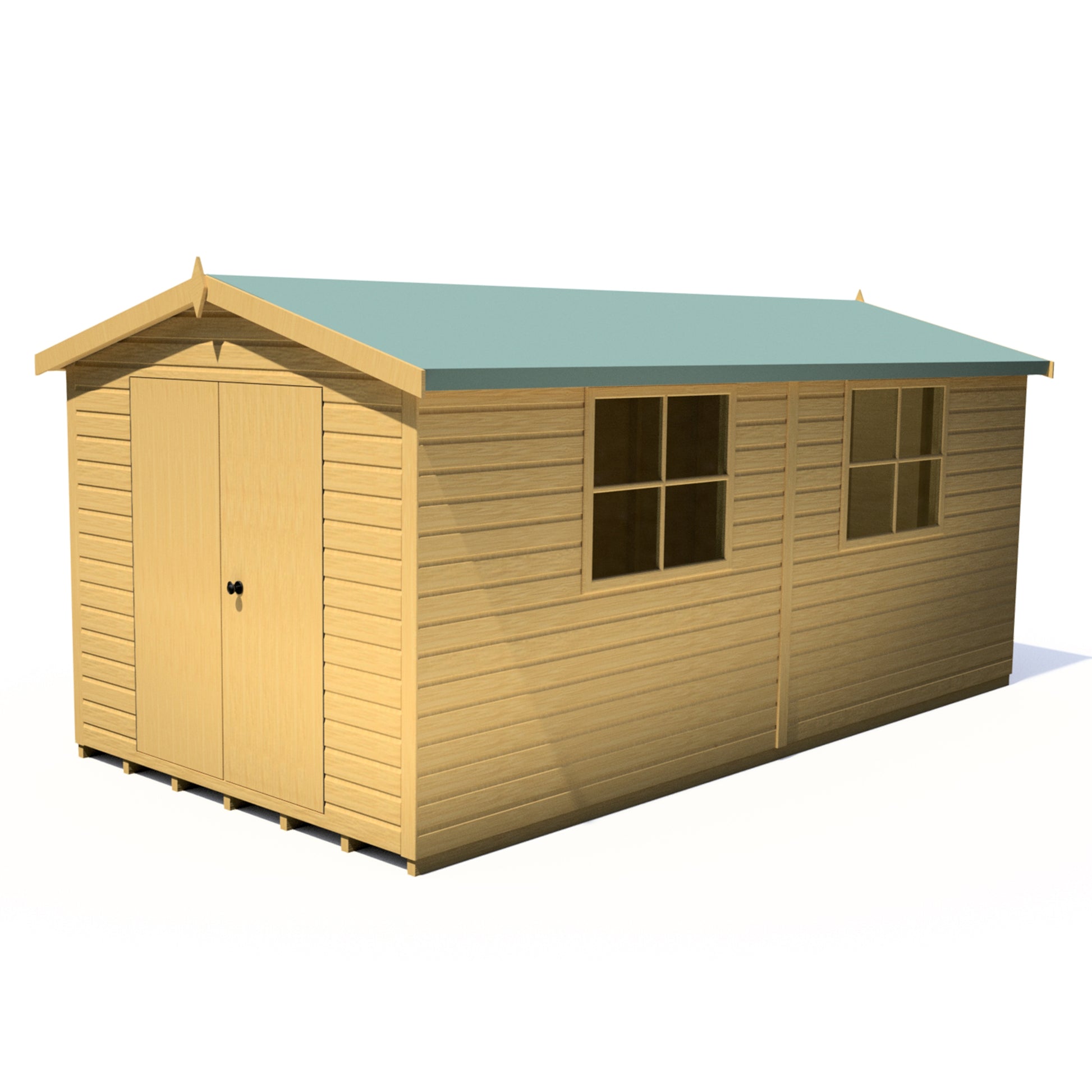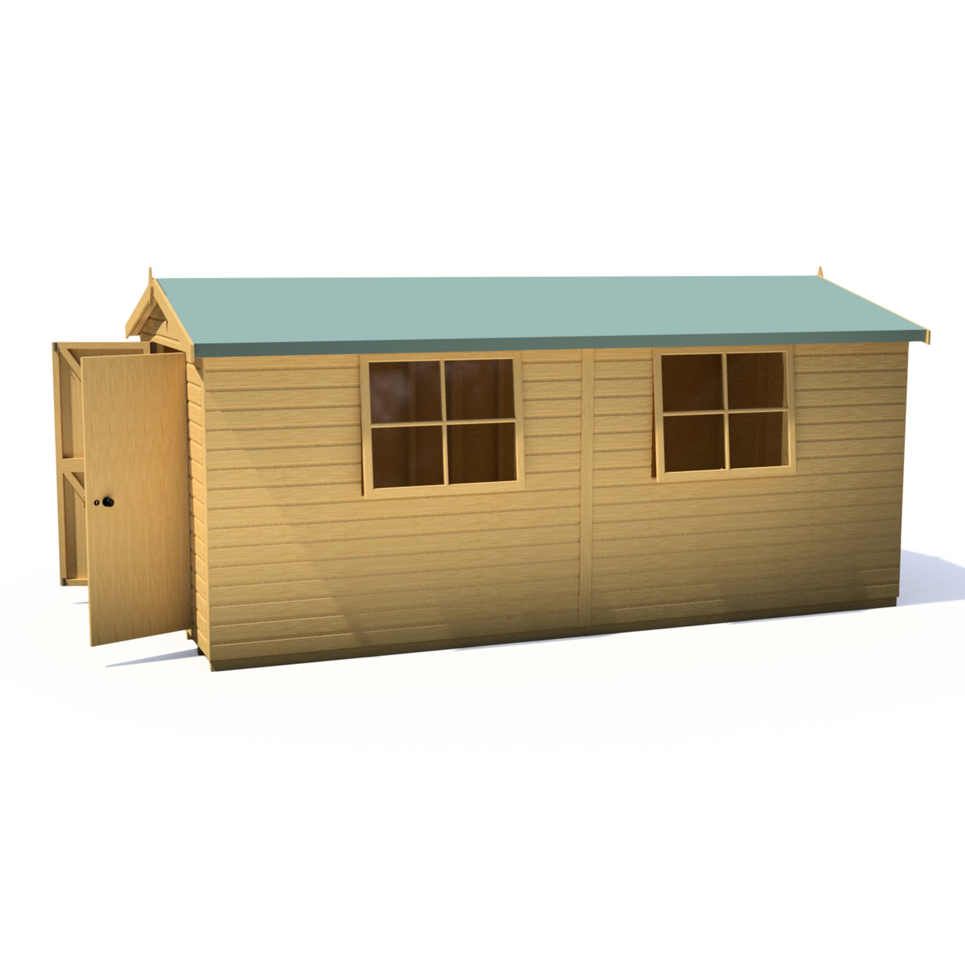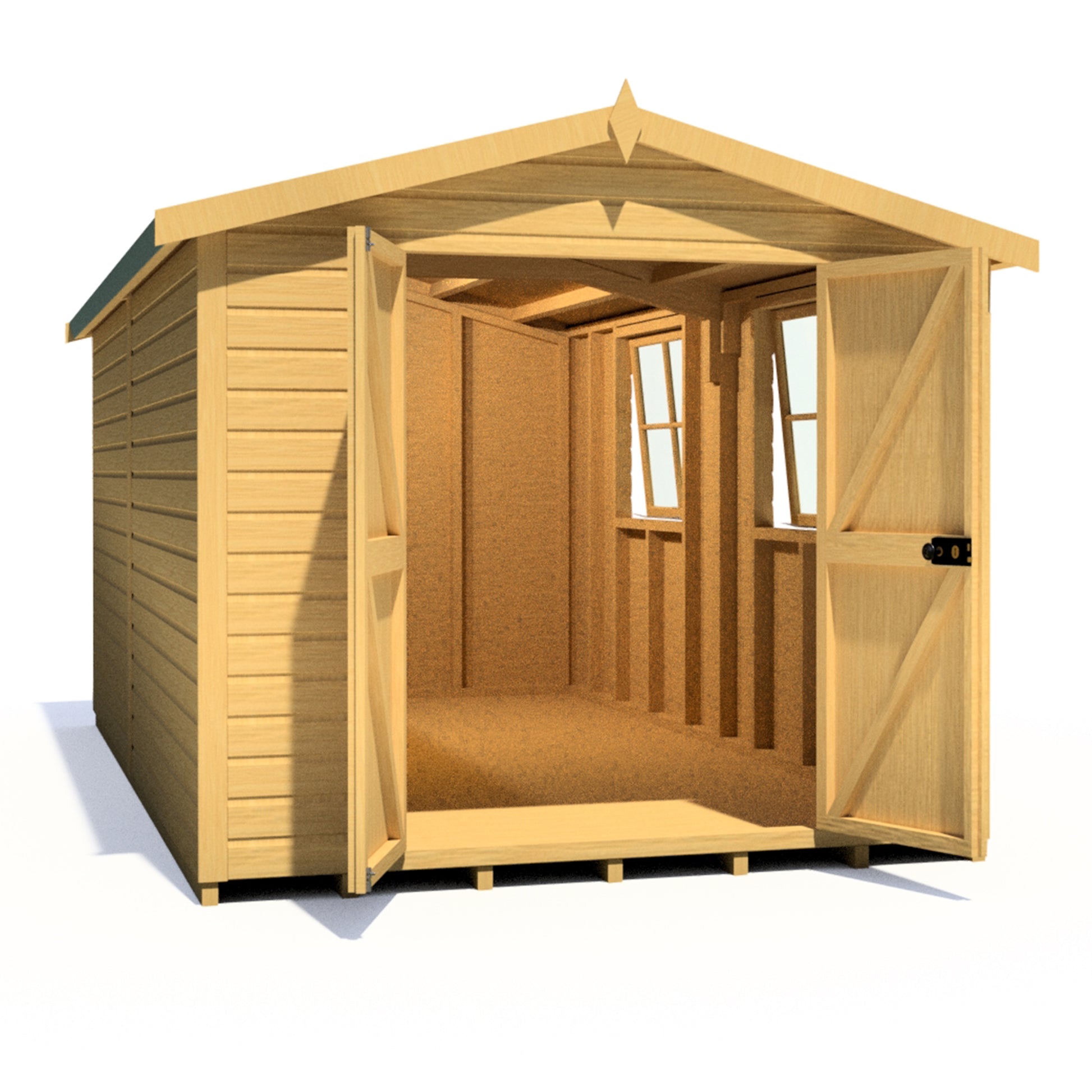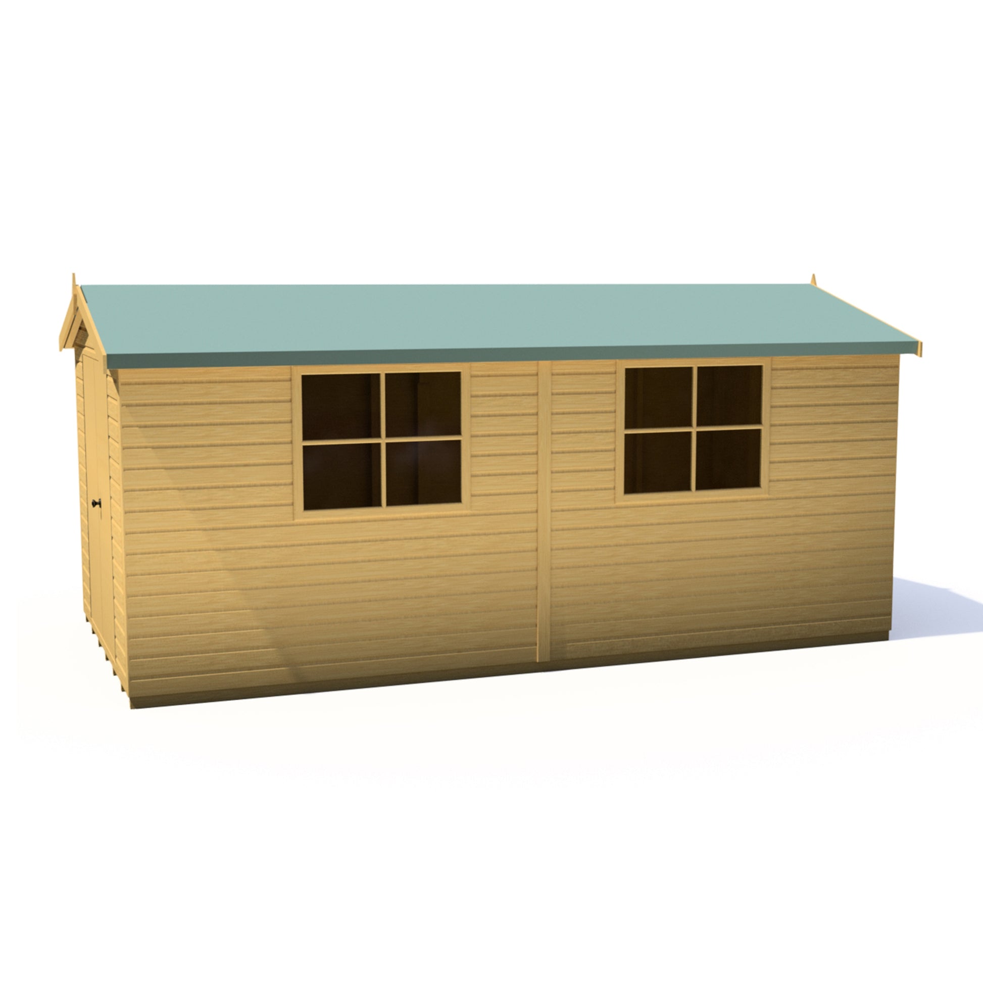 The Shire Bison Multi-Functional Shiplap Apex Workshop Shed is a versatile, weatherproof solution for both storage and DIY tasks. Made with FSC-certified wood and a felt roof, it provides a secure space for storing power tools, furniture, and gardening equipment. It features two framed braced doors, storm-resistant windows, and a supported workbench for comfort. With a 6ft internal height, this shed offers ample room for comfortable movement, making it an ideal space for any domestic workshop or storage needs.