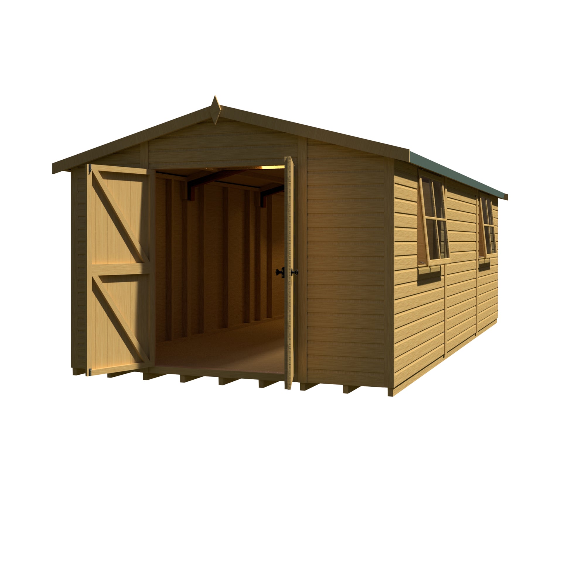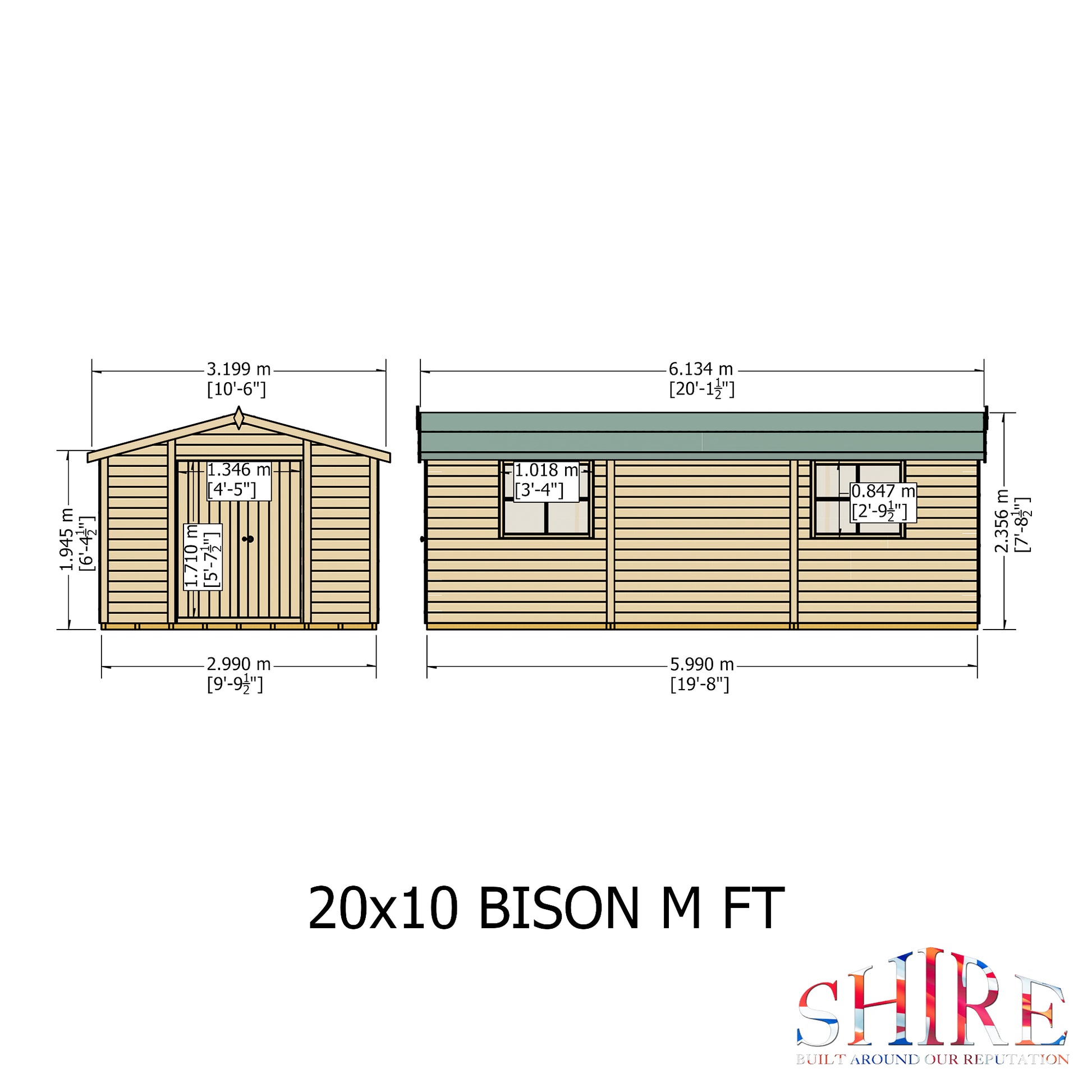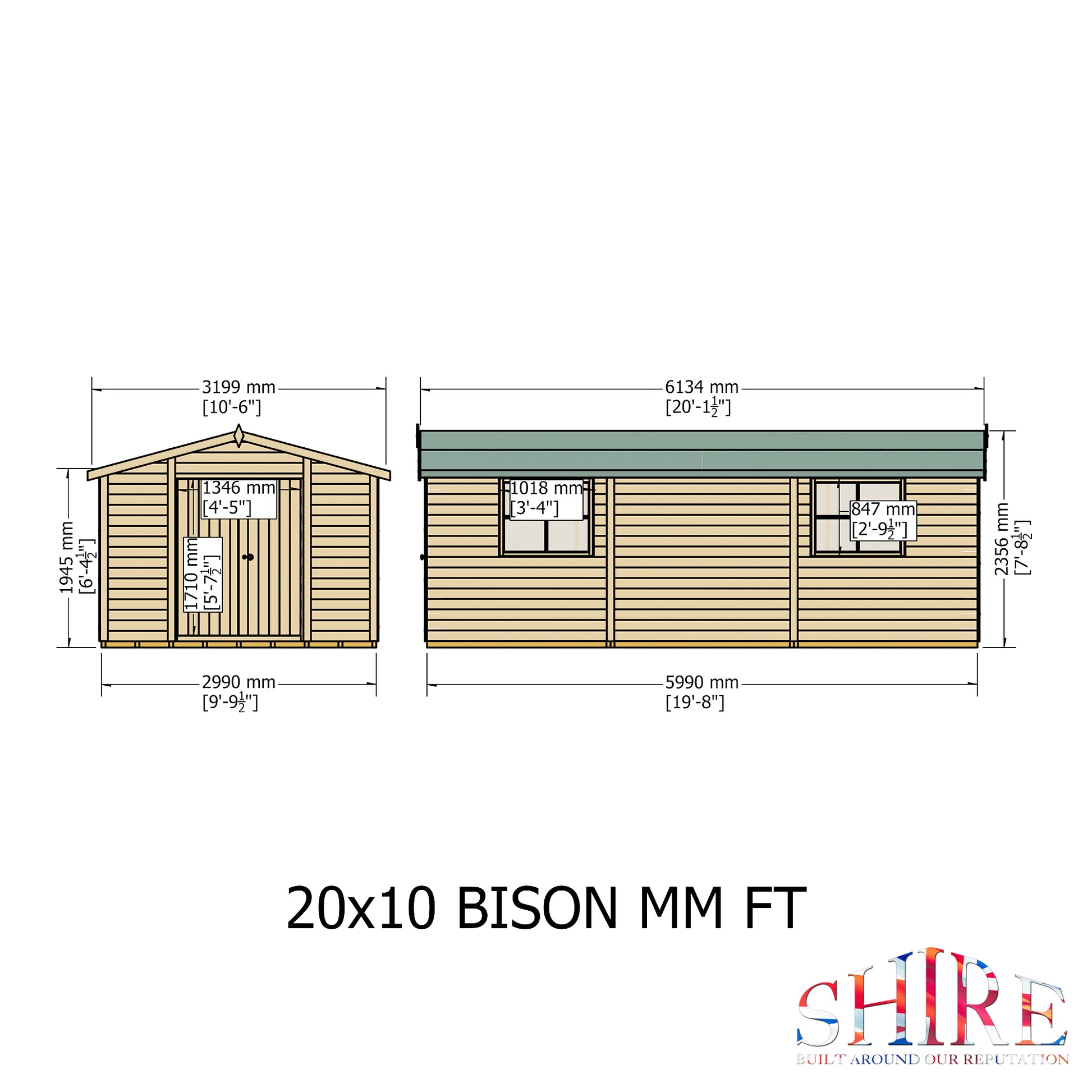 The Shire Bison Multi-Functional Shiplap Apex Workshop Shed (20 x 10) is the ideal solution for both storage and DIY projects. Made from FSC-certified wood with a durable felt roof, it offers secure space for tools, furniture, and more. Featuring two fully framed braced doors, storm-resistant windows, and a supported workbench, it provides comfort and convenience. With a minimum 6ft internal height, this shed ensures ample room for safe and efficient movement while working or storing equipment.