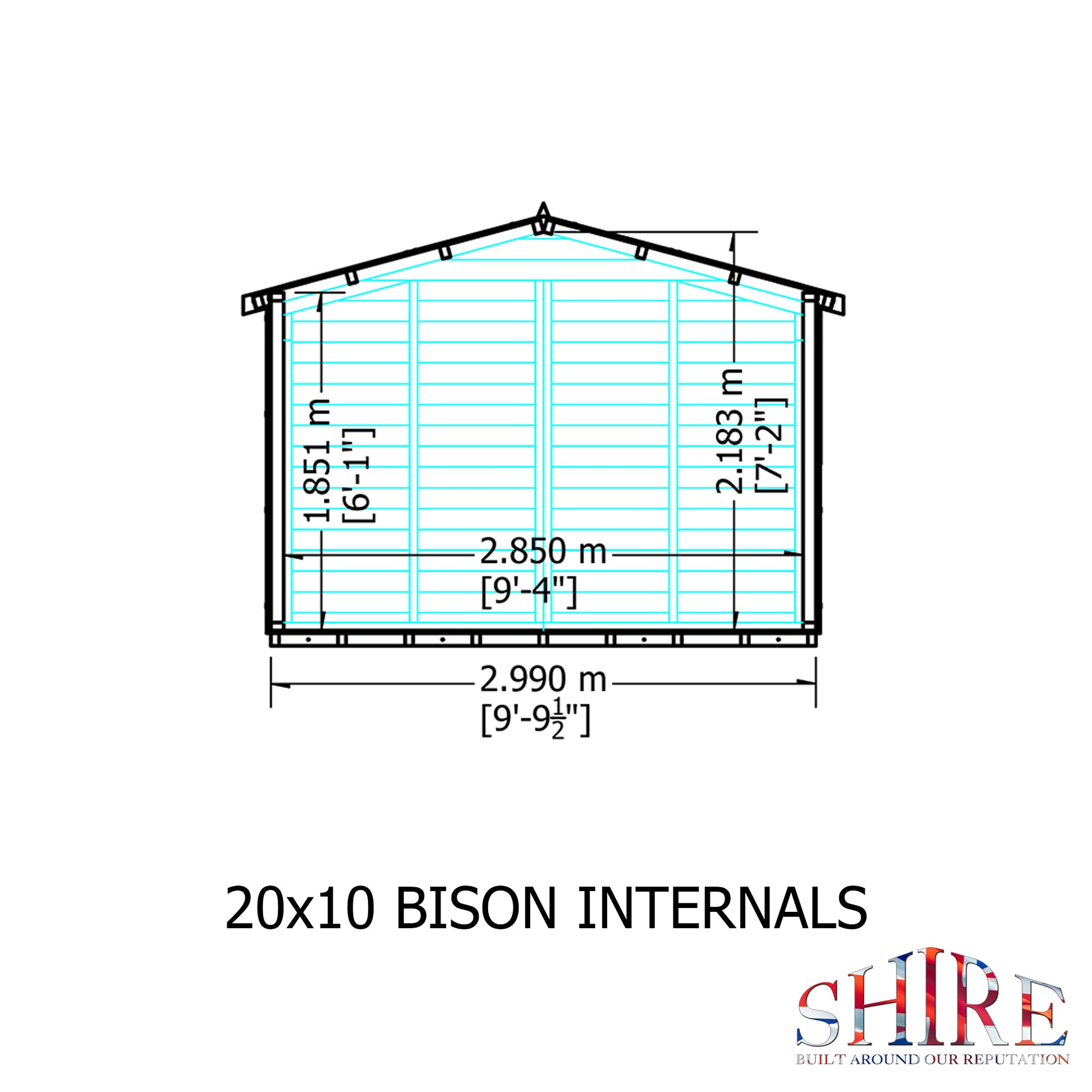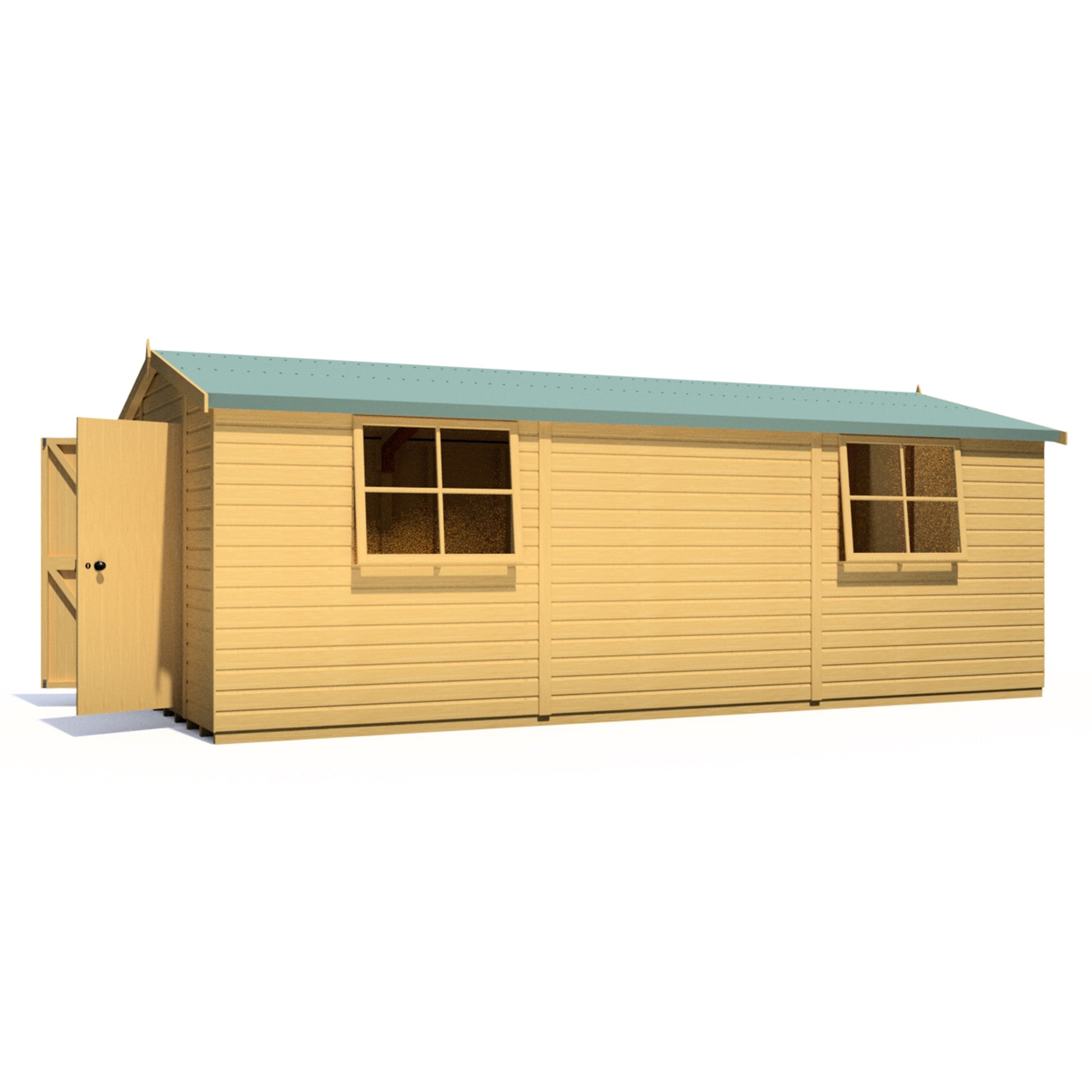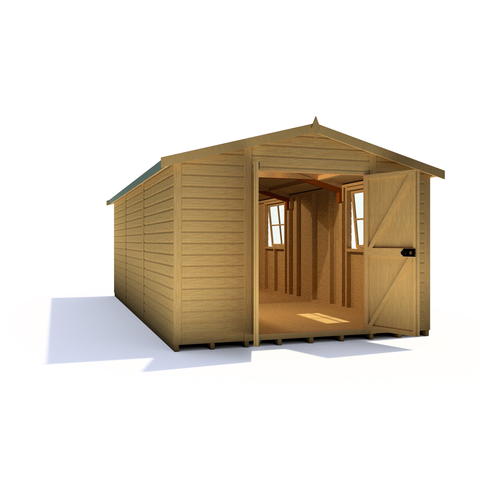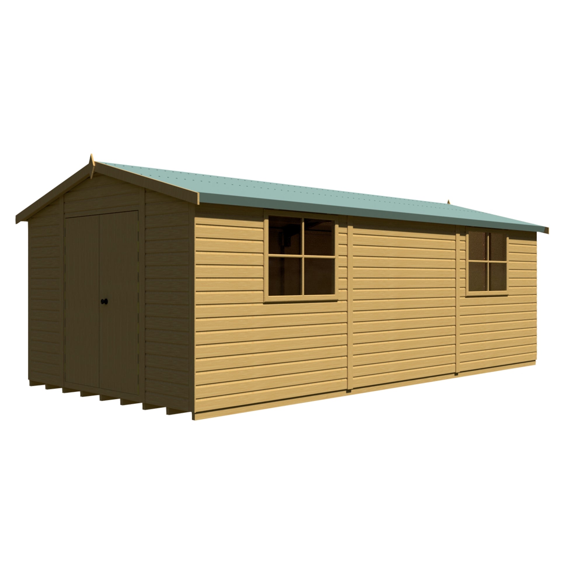 The Shire Bison Multi-Functional Shiplap Apex Workshop Shed (20 x 10) is the ideal solution for both storage and DIY projects. Made from FSC-certified wood with a durable felt roof, it offers secure space for tools, furniture, and more. Featuring two fully framed braced doors, storm-resistant windows, and a supported workbench, it provides comfort and convenience. With a minimum 6ft internal height, this shed ensures ample room for safe and efficient movement while working or storing equipment.