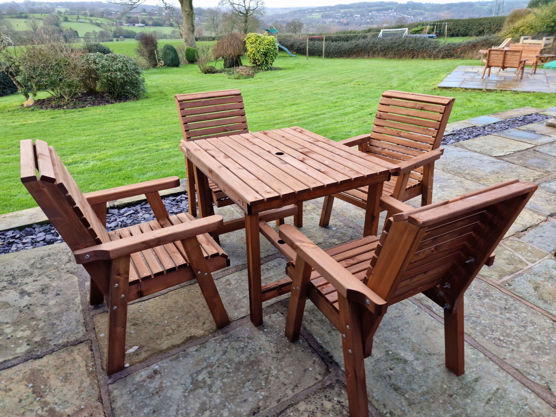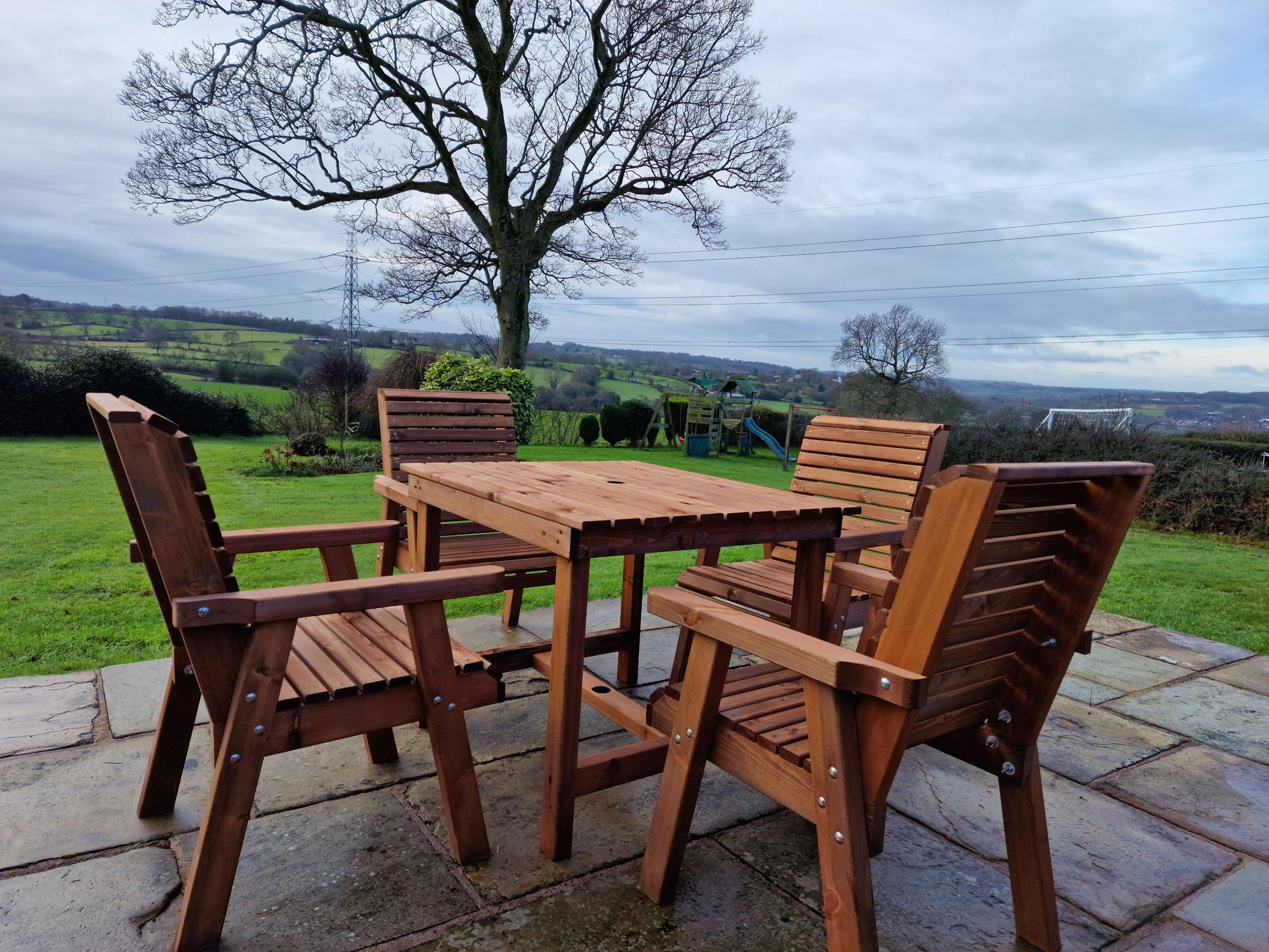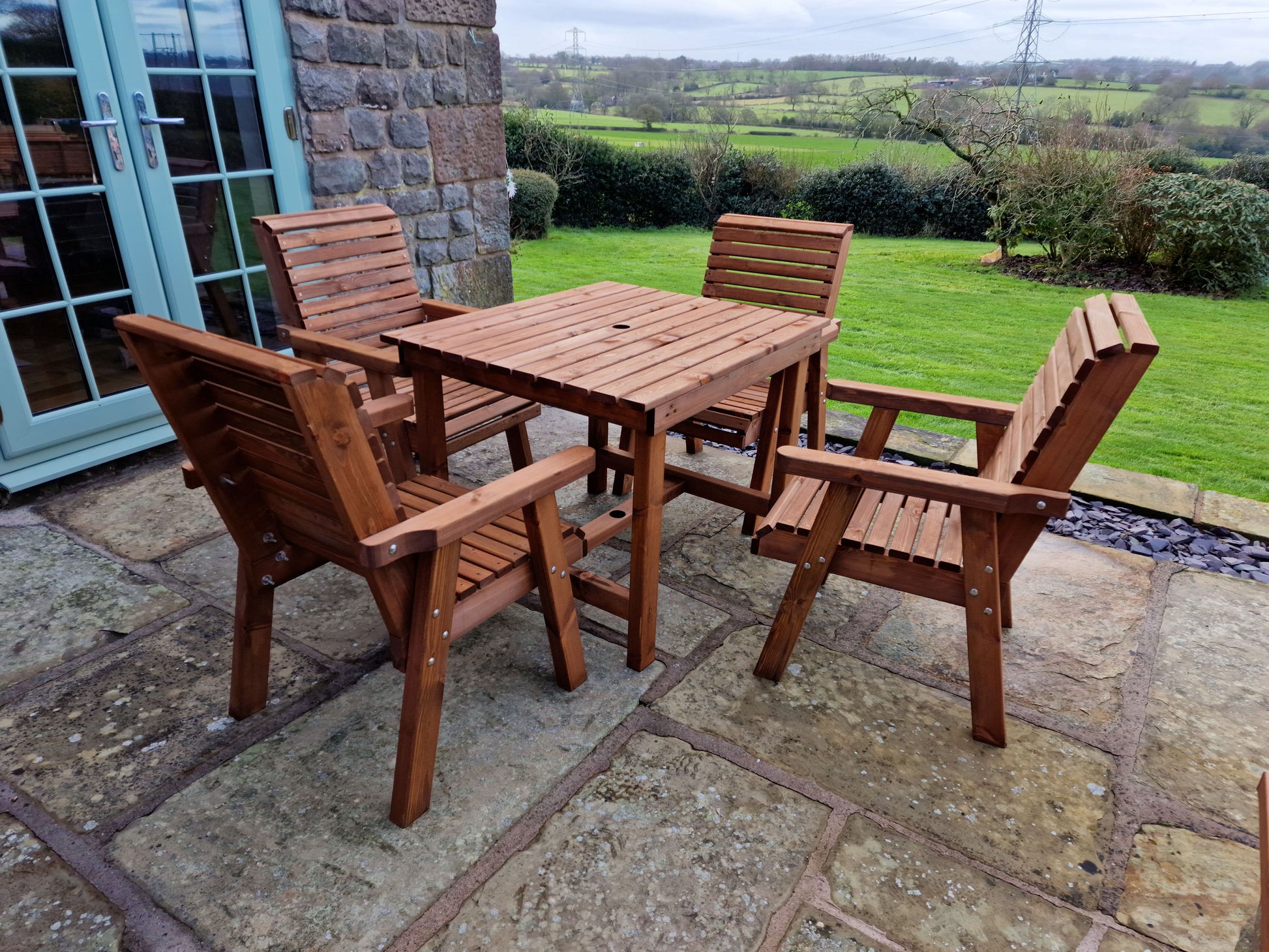 A truly stunning garden set,This beautiful arrangement has been built by British craftsmen in this unique style using the finest Swedish Redwood. The wood has a base treatment with anti-fungal, anti-mould and UV protection. You will need to re-treat annually to prevent from rot.