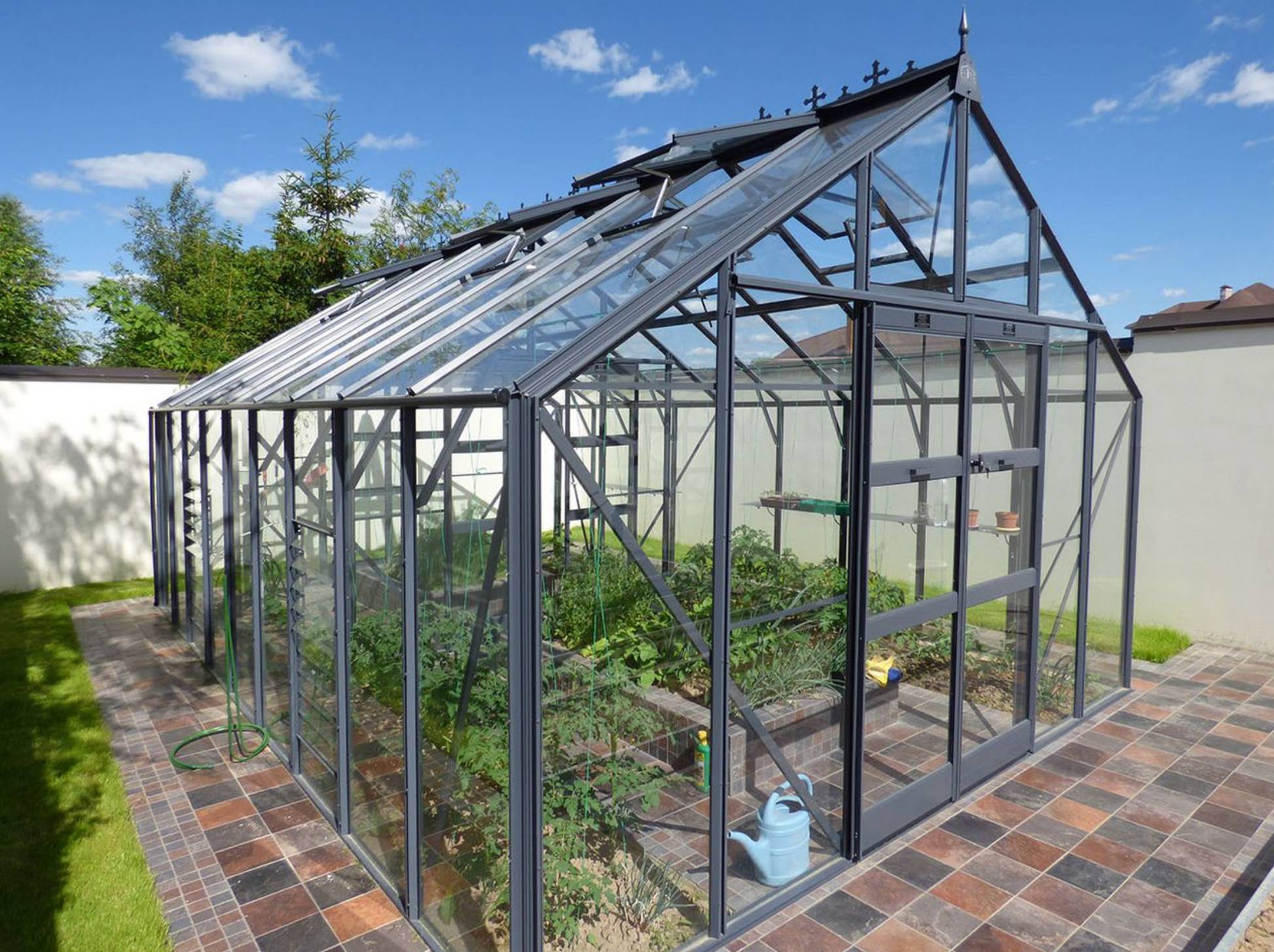 Beat the heat with roof vents and a 10 blade louvre window included in the Elite Titan. Personalise your greenhouse with options like frame colour, base choices, and cresting and finials to make it uniquely yours.