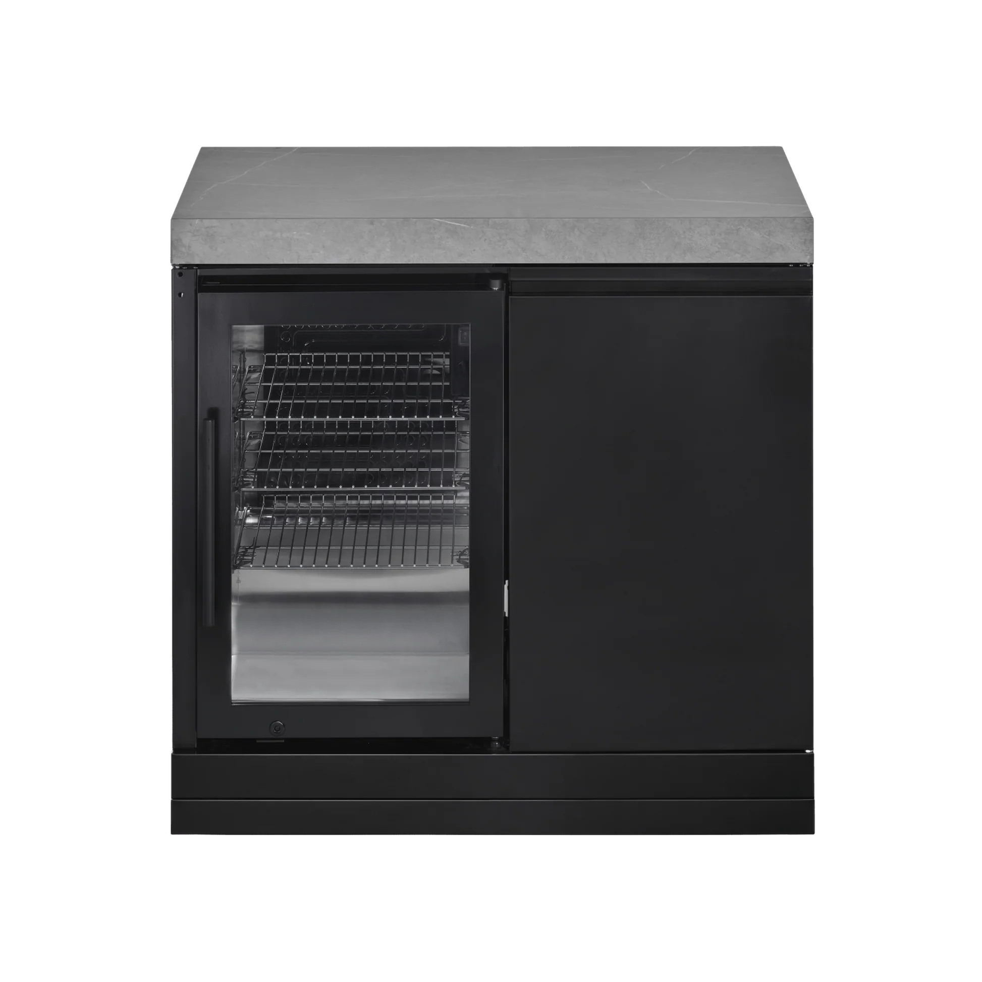 - Durable Stone Worktops: 60 mm sintered stone worktops with concrete-effect finish, heat-resistant and weatherproof.