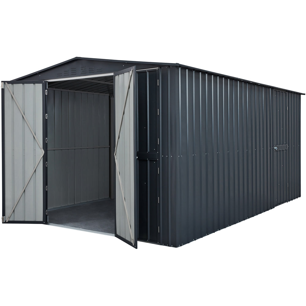 The Mercia 10 x 15 Globel Dual Door Workshop Garage in Grey is a spacious, secure, and maintenance-free garden storage solution. Constructed from high-tensile galvanised steel, it features lockable bi-fold doors, an apex roof for rainwater run-off and extra headroom, built-in vents for airflow, and a windowless design for maximum security. Complete with a 15-year anti-rust warranty, this shed is ideal for storing bulky equipment and tools.