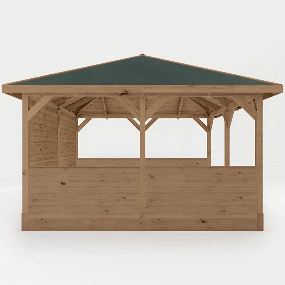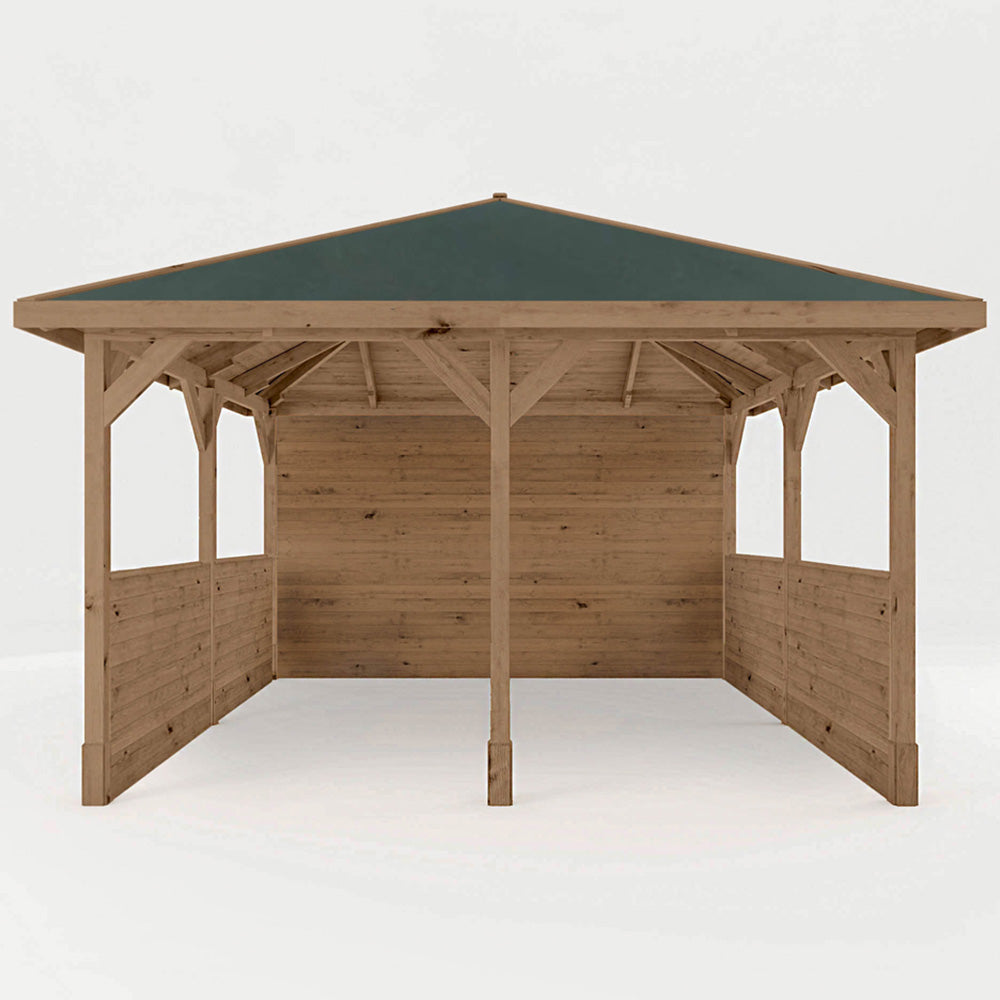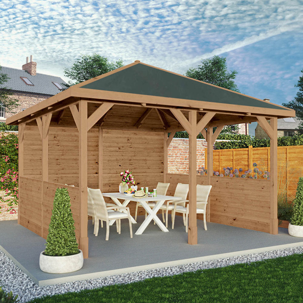 The Mercia 4m x 4m Traditional Gazebo with Side Panels creates a versatile outdoor retreat, perfect for dining, relaxing, or covering a hot tub. Featuring a tongue & groove roof with mineral felt, plus 2 full-height and 4 half-height boarded panels, it offers maximum shelter and privacy. Built with robust 4x4” posts and interlocking 1.5x5” beams from pressure-treated, sustainably sourced timber, it resists rot, decay, and insects. Quick to assemble and backed by a 15-year anti-rot guarantee.