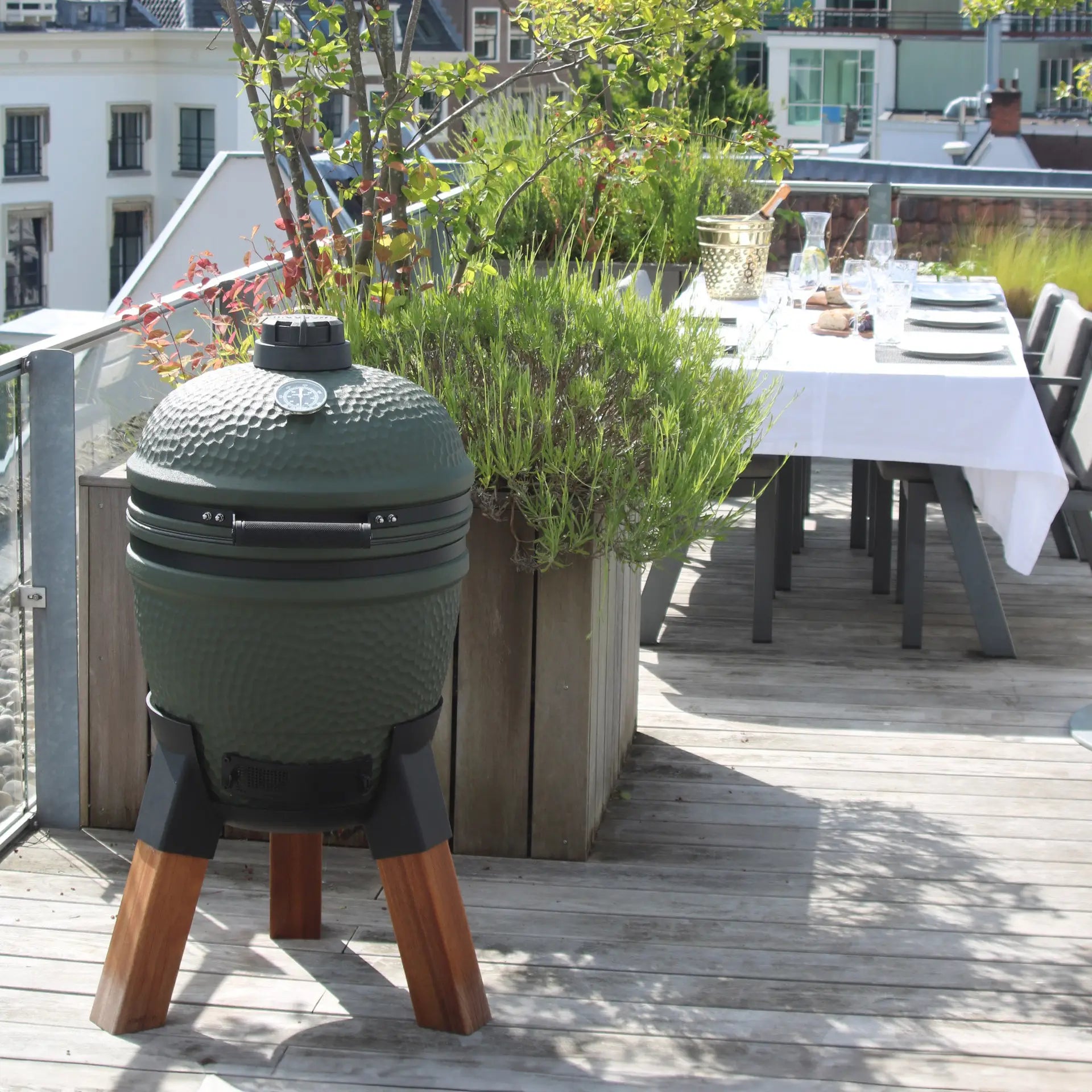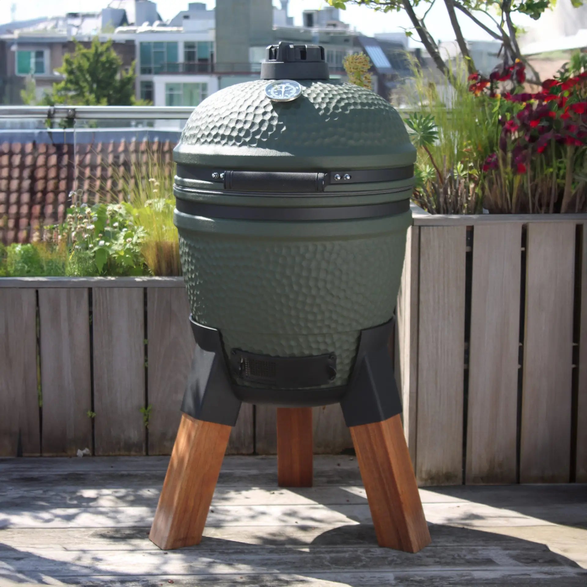 The contemporary kamado grill seamlessly blends aesthetics with practicality. Crafted from premium ceramic, it offers excellent heat retention and uniform heat distribution, guaranteeing flawlessly grilled meals every time. Its distinctive matte green finish makes it a stunning focal point in any garden. The robust wooden base provides exceptional stability. Additionally, this grill features a high-quality, condensation-resistant thermometer. With adjustable top and bottom vents, you can effortlessly control the cooking temperature.