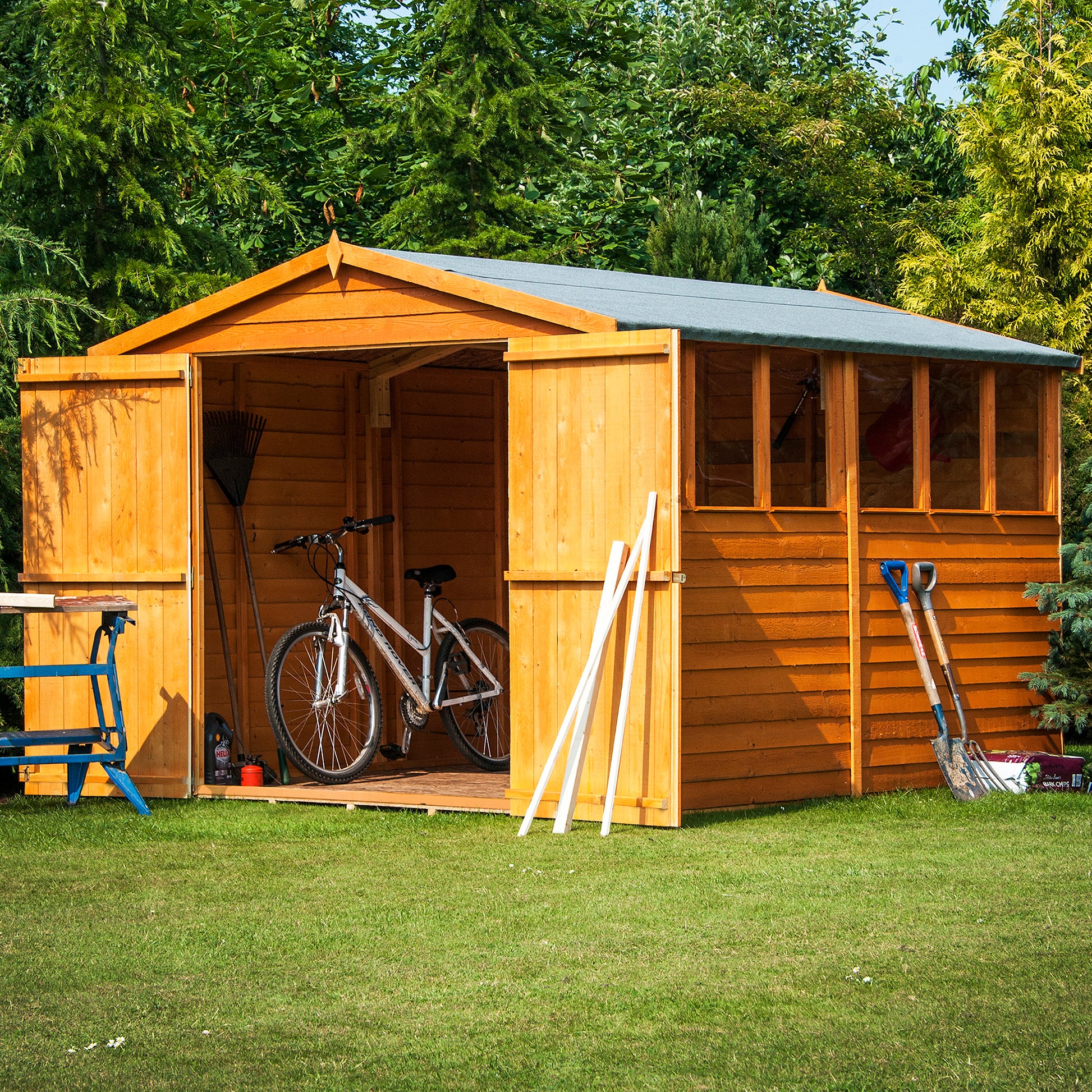 The Shire 10×8 Overlap Apex Shed with Double Doors provides a durable, spacious, and affordable garden storage solution. Made from rustic white pine from sustainable forests, it features mould-resistant, dip-treated overlap cladding, double doors for easy access, fixed styrene windows for natural light, and a solid OSB roof and floor. Delivered flat-packed with mineral roofing felt and DIY assembly instructions, this shed combines quality, value, and practicality.