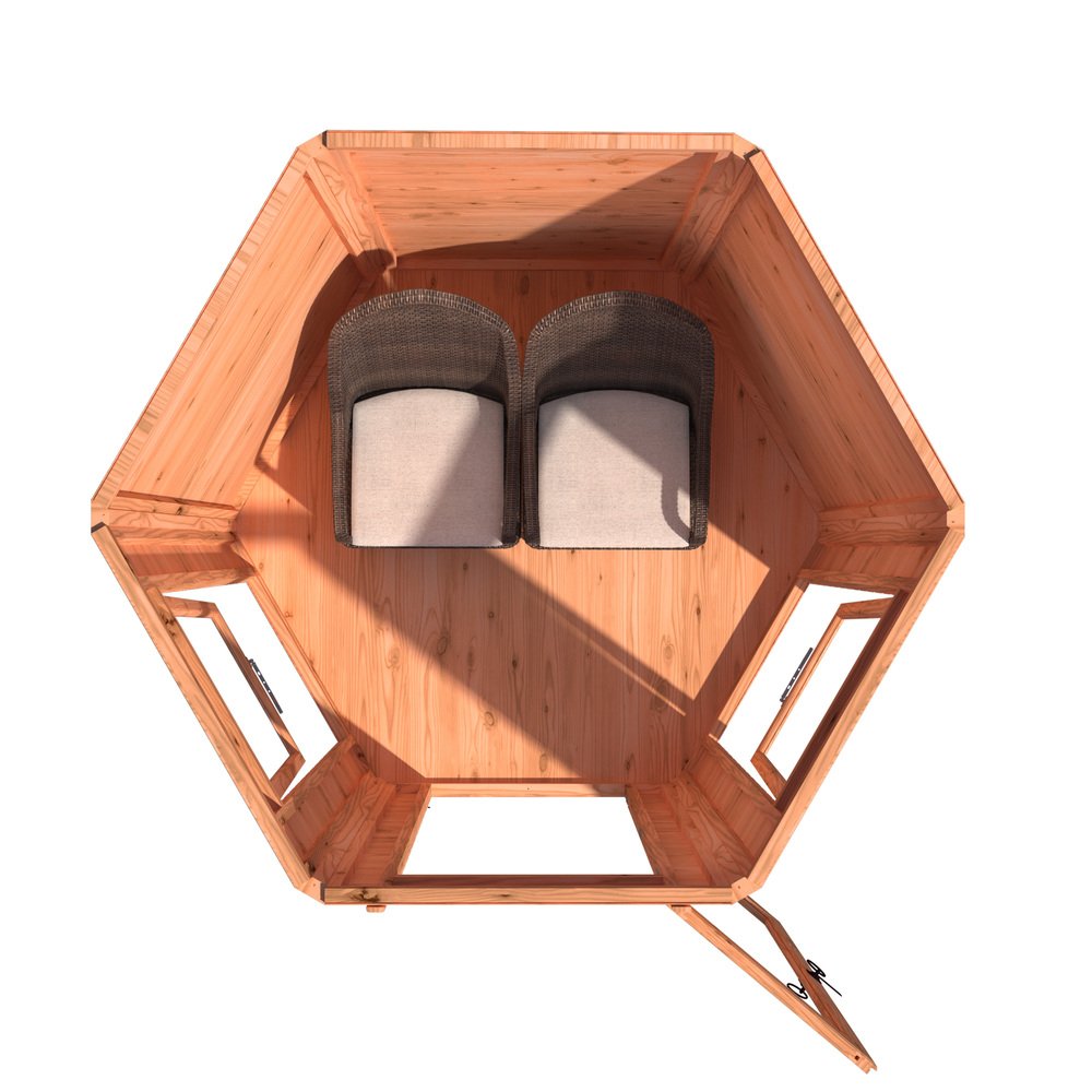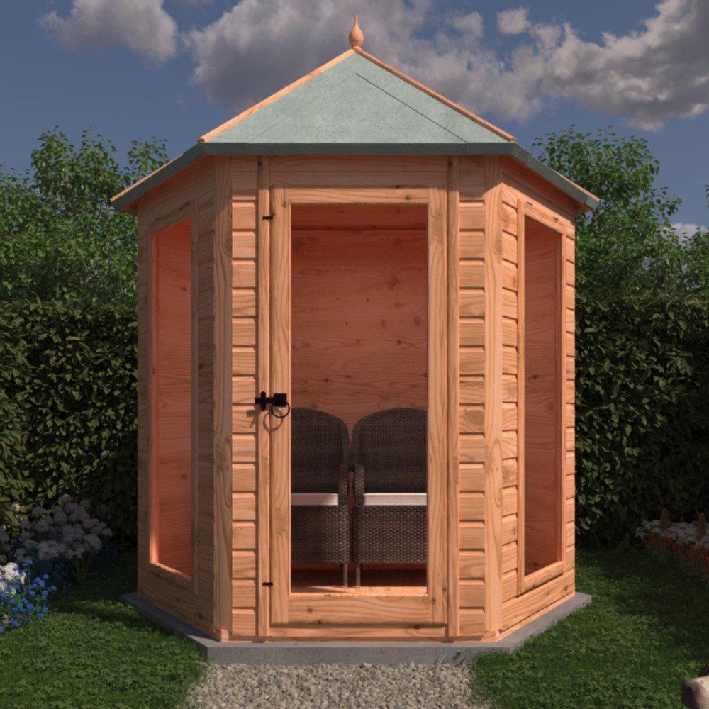 Enhance your garden with the Shire Kendall 7x6 Hexagonal Summerhouse, a compact and stylish retreat that combines traditional charm with robust construction. Its hexagonal design provides a unique, panoramic view of your surroundings, creating a bright and inviting space for relaxation, work, or entertaining. Crafted from high-quality FSC-certified timber, the Kendall Summerhouse features 12mm tongue and groove shiplap walls, roof, and floor, supported by 34mm x 34mm framing and reinforced 87mm x 44mm corner posts for superior stability. Traditional mortised and tenoned joinery ensures both durability and craftsmanship, while two large opening acrylic windows and a single door flood the interior with natural light and fresh air.