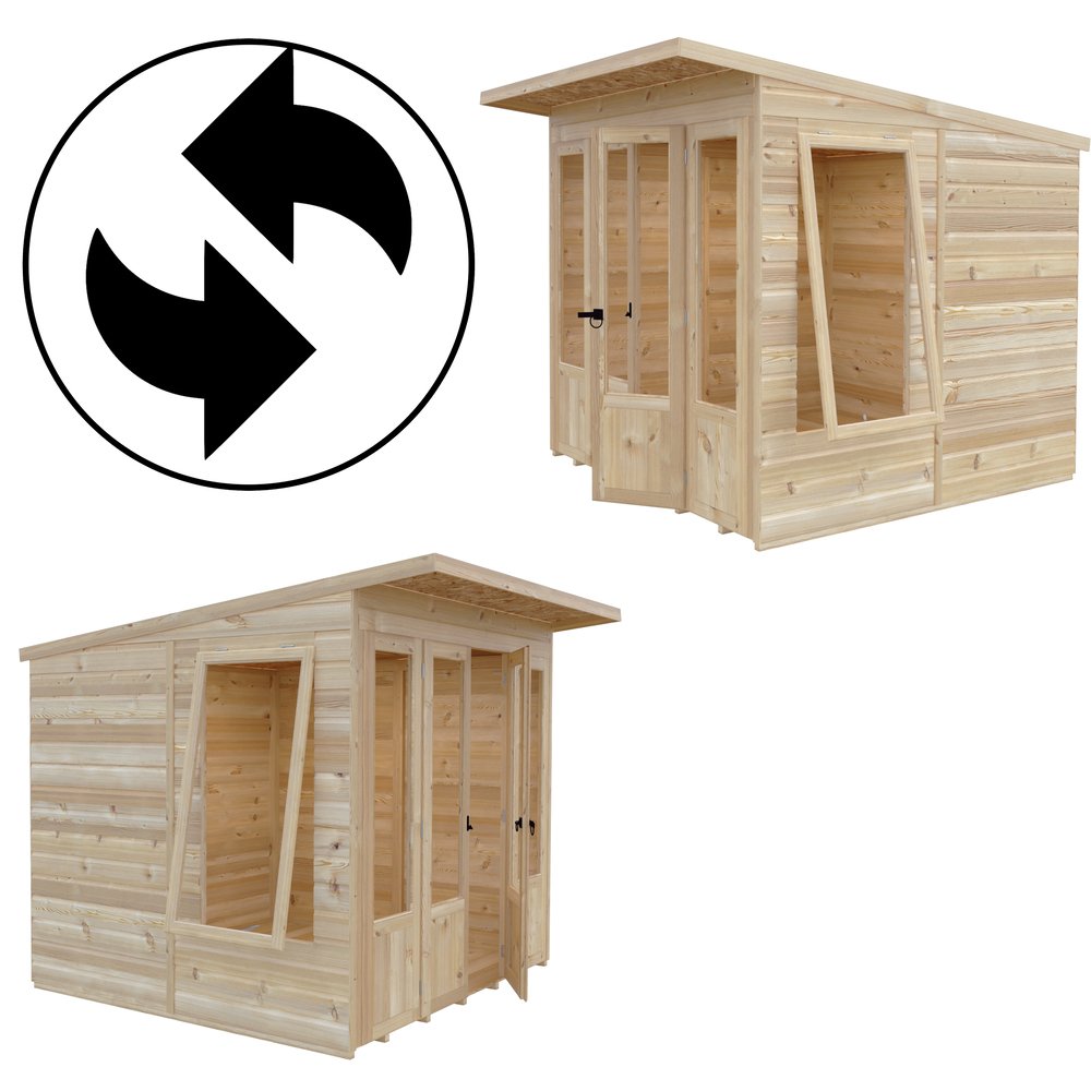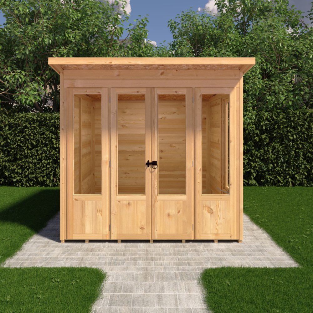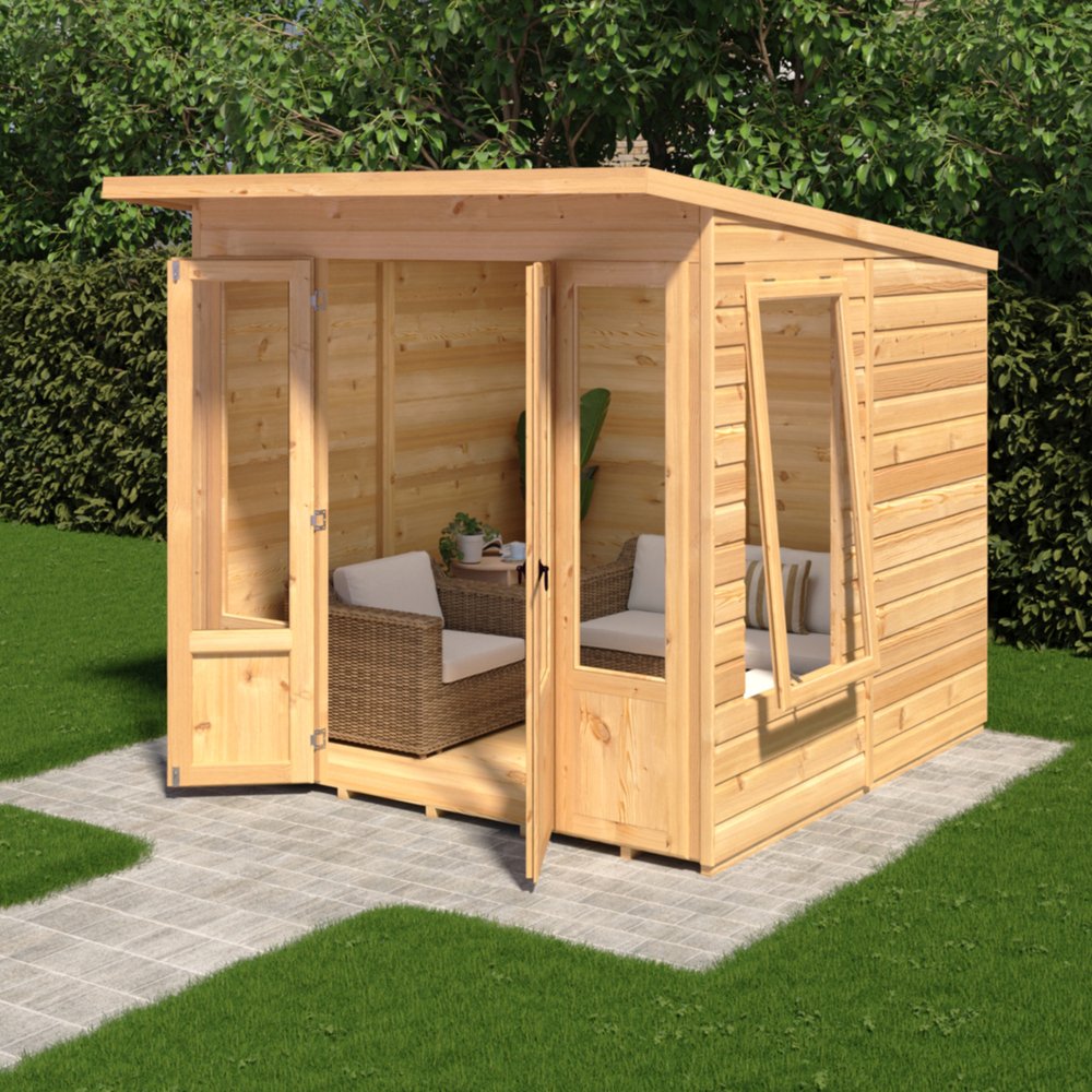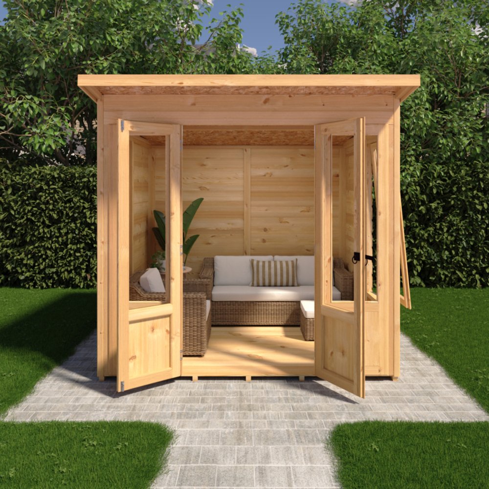 The Shire Parham 7x7 Pent Summerhouse is a stylish and versatile garden room that combines contemporary design with classic timber craftsmanship. Its pent roof and clean lines give a modern aesthetic, while the large acrylic-glazed windows and three-quarter-length glazed double doors fill the interior with natural light, creating a bright and inviting space. Crafted from 12mm tongue-and-groove shiplap timber set within a robust 34mm x 34mm frame, the Parham Pent is both strong and durable. The solid 12mm tongue-and-groove floor provides stability for furniture or décor, while the OSB roof and mineral felt covering ensure long-lasting weather protection. The side-opening window enhances ventilation, making it perfect for warm summer days.